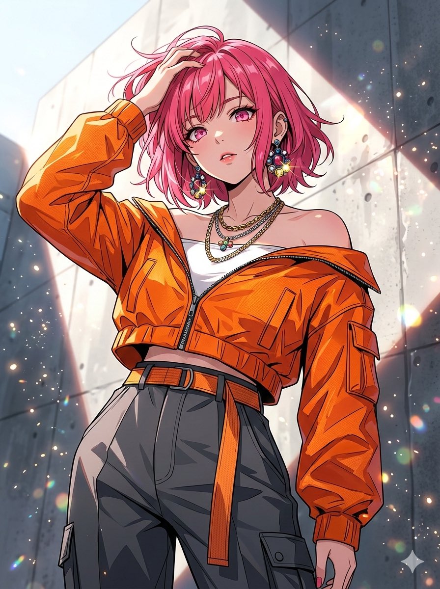 衣装とポージングは方向性だけ指定して自由度を持たせる。 参考にする画像はうちの子のレイラ🟧のバストアップ画像を使う。 あえて細かい指定はせずに自力で考えてもらい表現の差を見てみる。