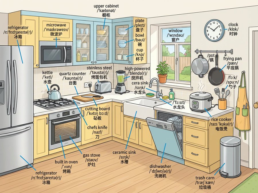 为我绘制一个详细的{{宠物商店}}场景 并标注所有物体的英语单词, 标注格式: 第一行:英文单词 第二行:音标(国际音标IPA格式) 第三行:中文翻译