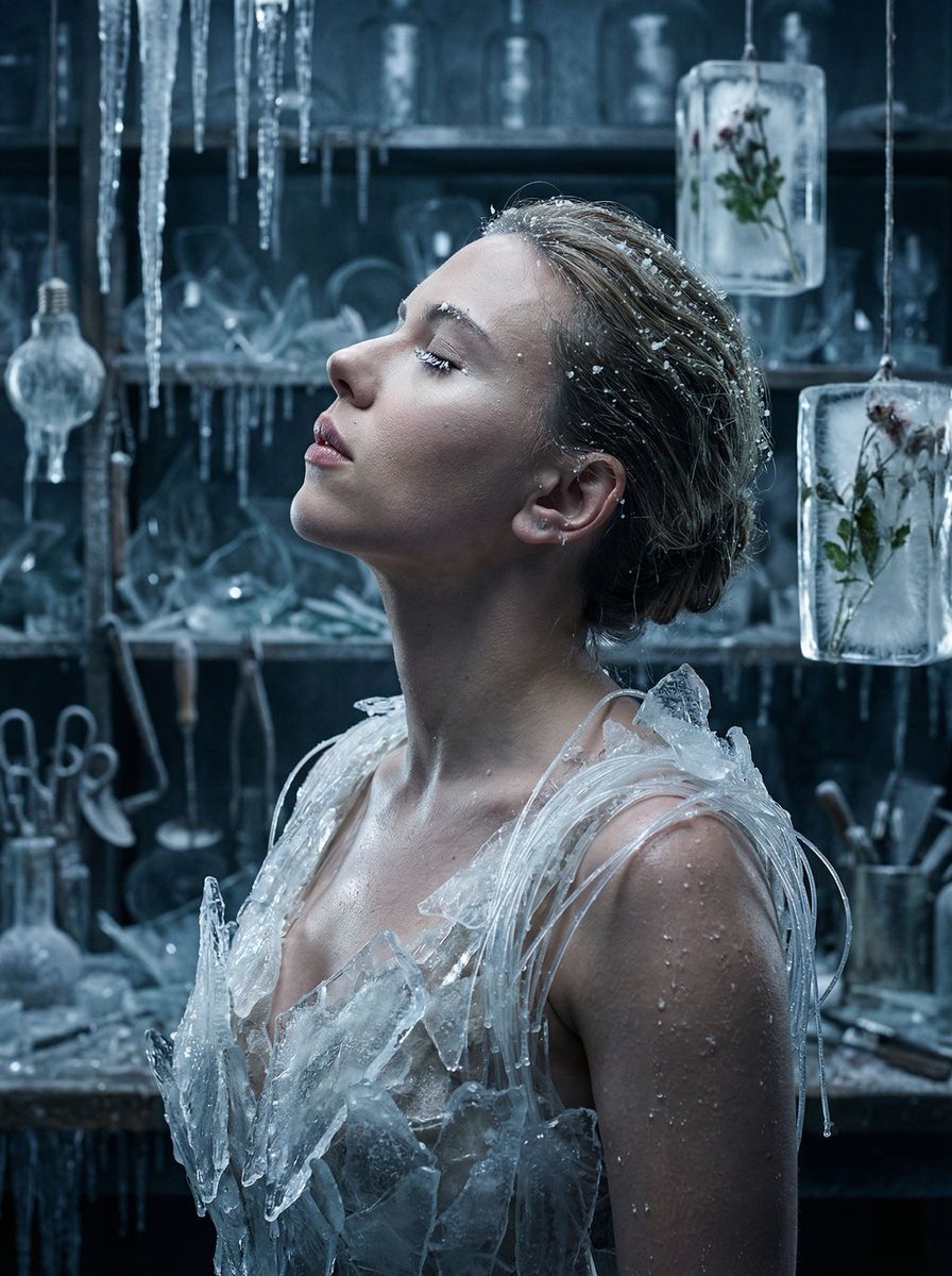 "master_prompt": "Cinematic surreal portrait of The Protagonist captured in a dense, cluttered 'Cryogenic Glass-Blower's Workshop.' The subject is framed in a tight profile, head tilted upward in a state of frozen serenity, mirroring the composition of an ice queen but grounded in tactile reality. The environment is overwhelmingly busy and textured: shelves overflowing with shattered glass shards, hanging icicles that look like stalactites, frosted vintage tools, and suspended botanical specimens encased in solid blocks of ice. The subject wears a surreal, avant-garde garment made entirely of jagged, melting ice shards and translucent fiber-optics that mimic frost, appearing heavy and wet against the skin. Hyper-realistic details focus on the condensation on the skin, individual snowflakes caught in the eyelashes, and the refraction of blue light through the clutter. Shot on a {argument name="camera model" default="Hasselblad H6D-100c"} with an {argument name="lens aperture" default="80mm f/1.9"} lens to achieve a razor-thin depth of field, blurring the chaotic background into a bokeh of cool blues and silvers. Lighting is moody and volumetric, with a 'moonlight' key light creating harsh, dramatic shadows (Chiaroscuro) and rim lighting accentuating the frost textures. Analog film simulation of Fujifilm Pro 400H with visible grain to ground the surrealism in physical photography. NO neon, NO digital art style.",