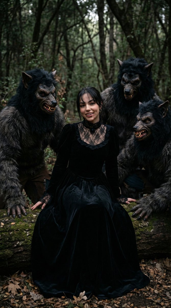 "scene": "A young woman dressed as a vampire sitting on a mossy log in a dark forest, flanked by three realistic werewolf creatures.",
