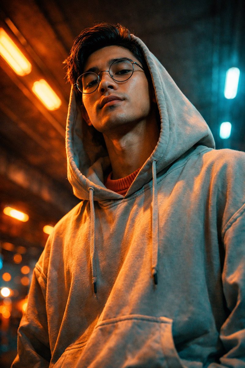 "face_lighting": "focused dramatic illumination on face and hoodie"