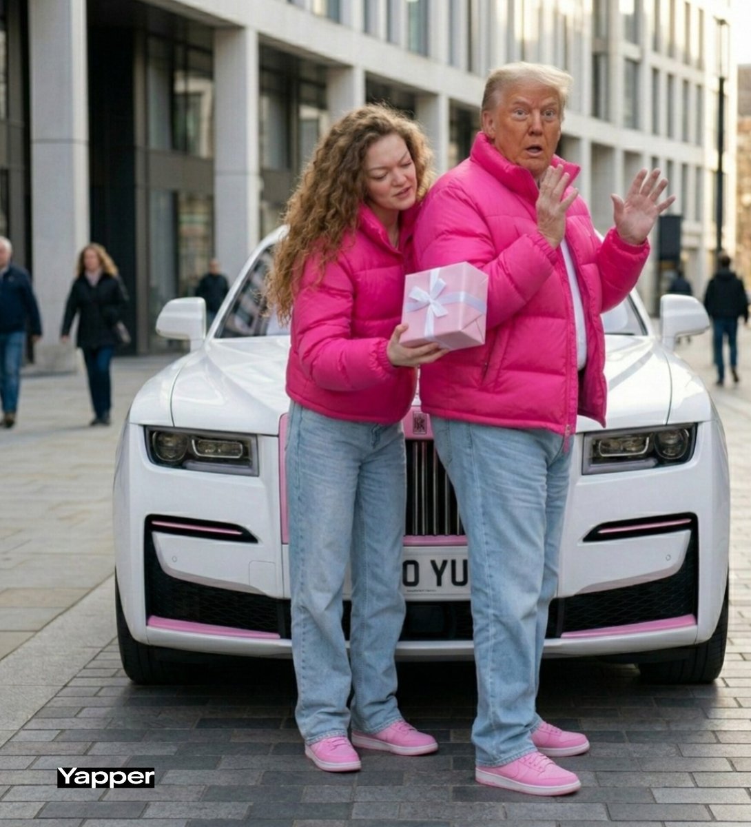 A realistic, high-end street-style photoshoot featuring me (use uploaded photo for face and body reference) standing confidently next to {argument name="celebrity 2" default="Donald Trump"} in front of a luxury white Rolls-Royce with pink custom grille accents. We are both wearing matching hot-pink puffer jackets, light-wash baggy jeans, and pink sneakers. He is adjusting his jacket collar while posing confidently, I am standing beside him with hands in pockets, stylish and confident expression. Natural daylight, cinematic lighting, shallow depth of field, ultra-realistic skin texture, 85mm lens look, high fashion iran editorial vibe, sharp focus, photorealistic, 8K quality.