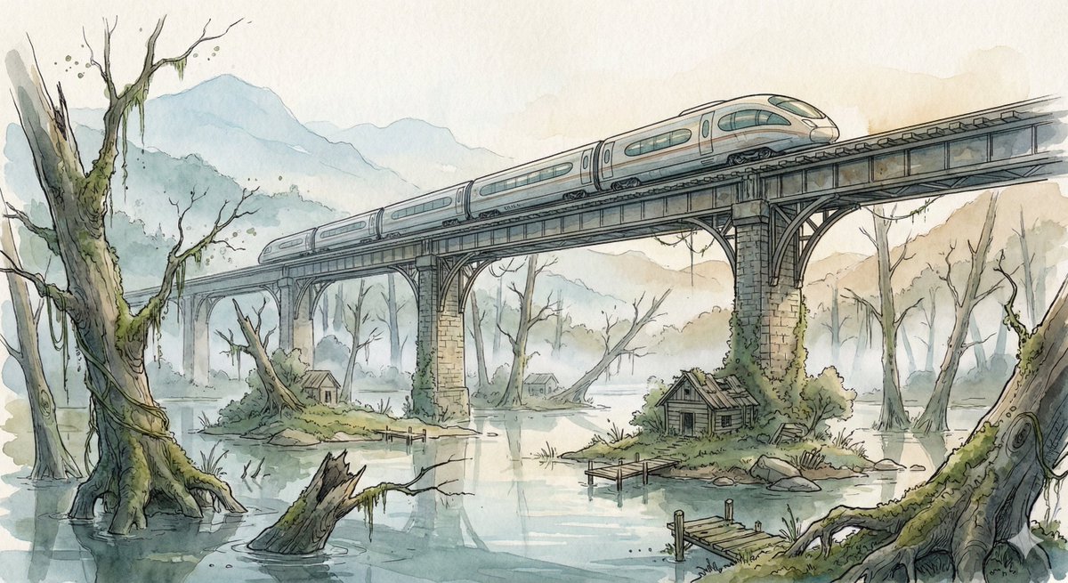 A sleek high-speed train glides across an elevated rail bridge spanning an enormous flooded forest valley. Half-submerged ancient tree trunks rise from still reflective water while small patches of moss-covered land hold abandoned wooden cabins and broken docks. Morning fog drifts between the skeletal trees, and distant mountains fade into pale atmospheric haze. The bridge stretches far into the distance, its repeating supports creating strong cinematic perspective lines across the quiet, mysterious landscape.
