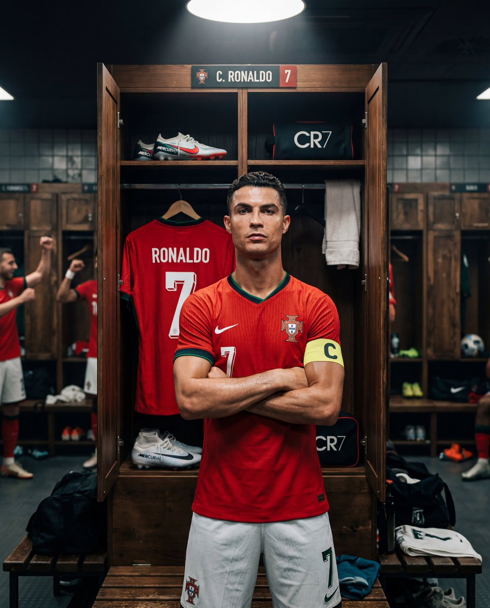 A cinematic, realistic locker room portrait of famous footballer {argument name="footballer name" default="Cristiano Ronaldo"}, showing his recognizable face, sharp jawline, short styled hair, and athletic build. He is wearing the {argument name="team jersey" default="Portugal national team red jersey"} with the Portugal crest. Ronaldo stands tall in front of the locker, arms crossed with a confident and focused expression.