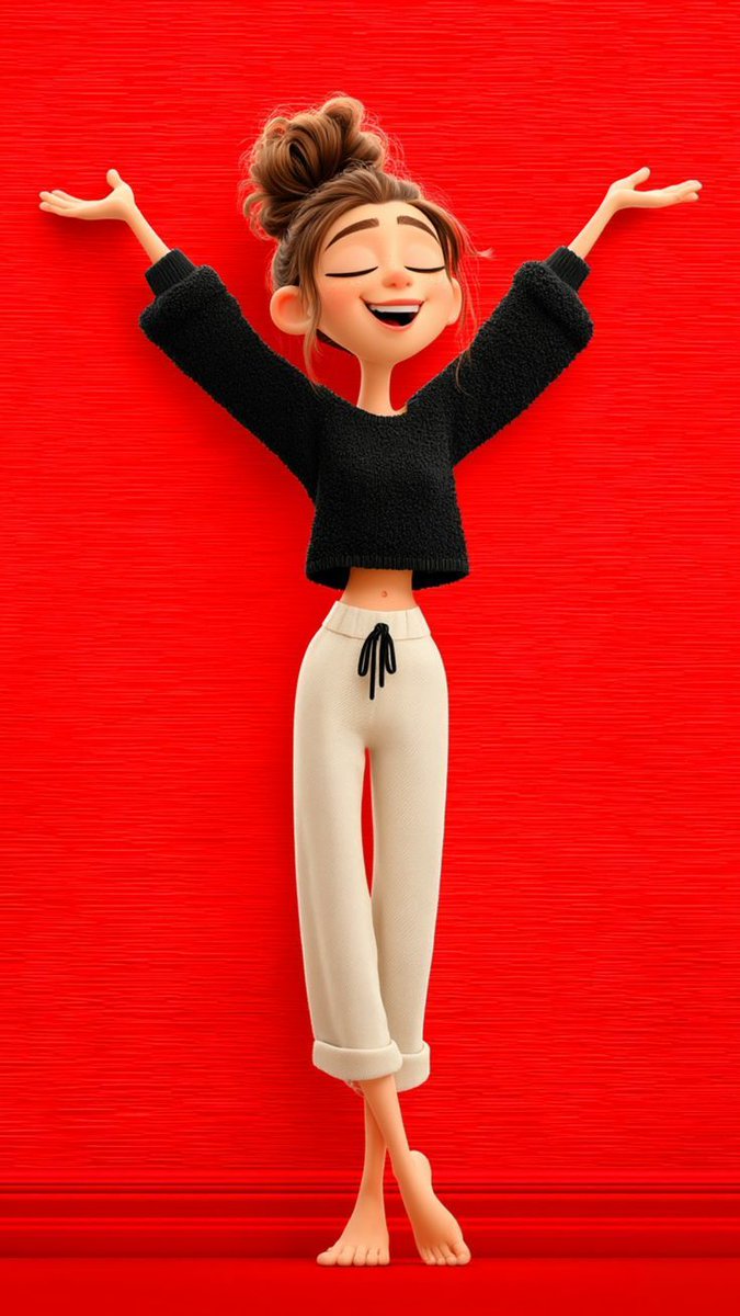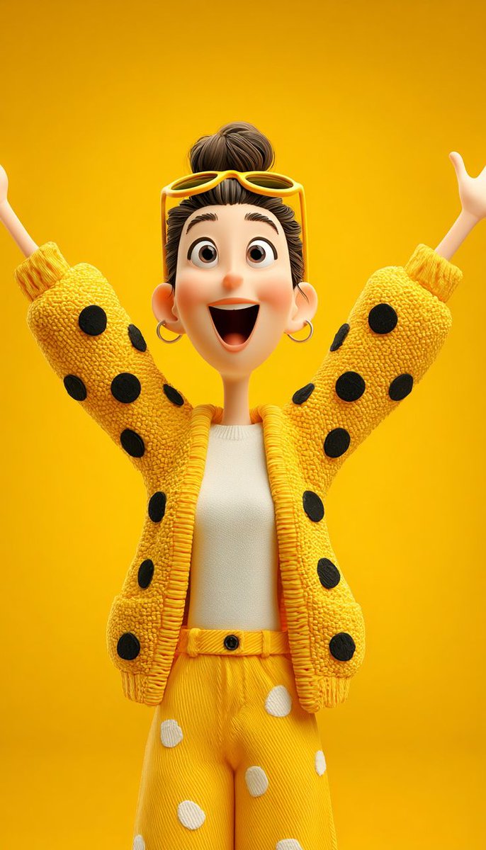 – bright yellow cardigan with playful polka-dot pants, joyful expression, arms raised, cheerful energy