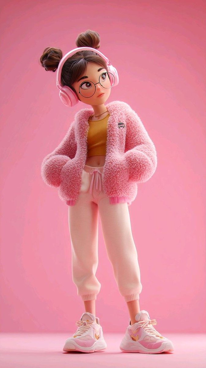 – pastel pink fluffy jacket with joggers and sneakers, wearing round glasses and headphones, calm and stylish pose