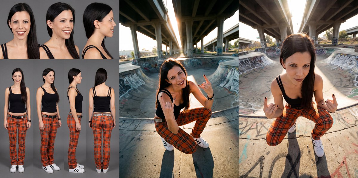 DSLR Character Sheet on a grey back drop. With three face profiles (front, 45° and side) and four full body portrait profiles (front, 45°, side and back). Photographed with a Canon SL3 with 17-85mm lens. No text overlays. Maintain consistency. 2:3 Ratio.