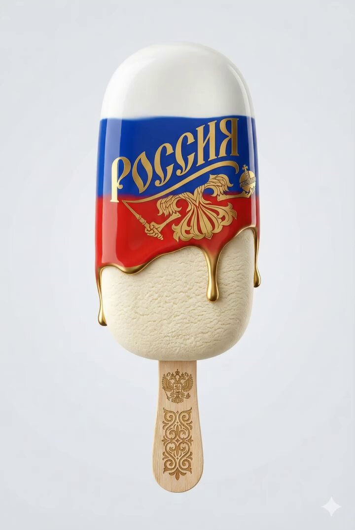 Perfectly vertical, hyper-realistic 3D ice cream on a stick from Russia with glossy glaze of the country's signature color and golden logo pattern dripping down the visible matte texture of the ice cream at the base. The stick features the country's logo with an ornament that characterizes the country's culture.
