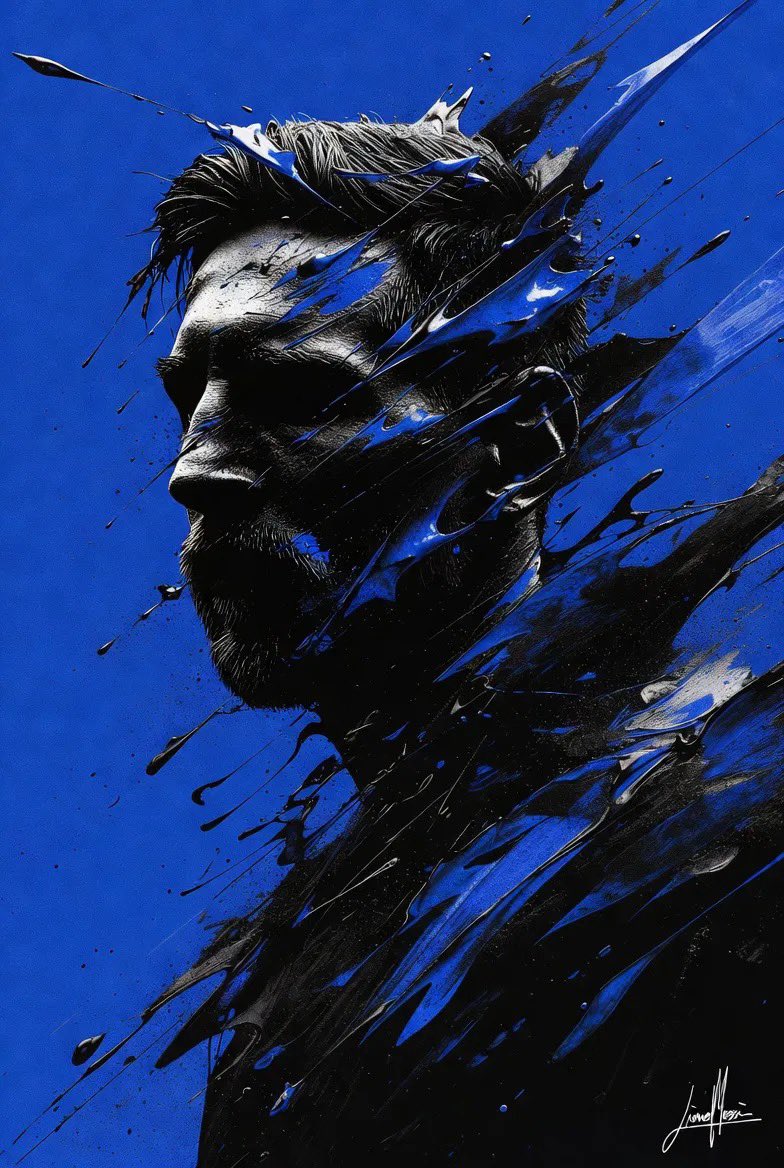 Convert this image into a dramatic, stylized portrait (use the same face as the uploaded photo), 9:16 aspect ratio, featuring a dark, almost silhouetted figure in profile looking to the left. The background is a deep electric blue. Intense black and sapphire paint splashes burst outward from the head and shoulders, creating powerful motion energy. Ultra-sharp lighting, cinematic contrast, HD photo.