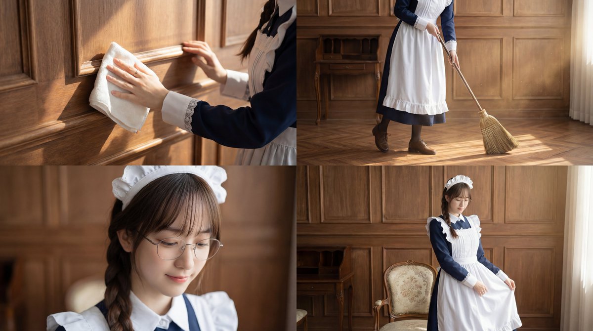 朝の柔らかな光に包まれ、楽しげに掃除をする人物のシネマティックなシーケンス。手元のクローズアップから始まり、舞い上がる埃や光の粒が映画的な質感を演出する中、リズミカルな動作とふとした瞬間の可愛らしい表情を捉える。スローモーションや浅い被写界深度を交えつつ、最後は達成感に満ちた温かい笑顔と静けさを映し出すワイドショットで締めくくられる、ハイキーでフィルムライクな映像美。