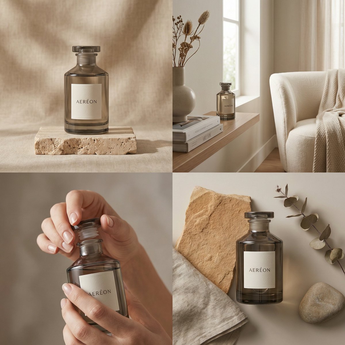 "Objective": "Create a refined 2×2 grid advertisement for the luxury home fragrance 'AERÉON', emphasizing mood, atmosphere, and sensory elegance through minimal, editorial-style visuals.",