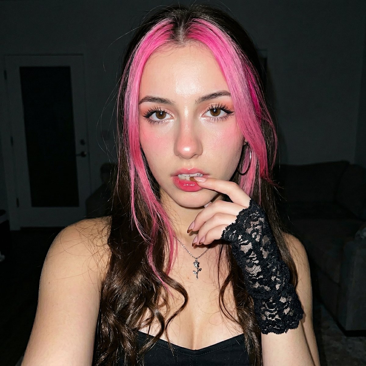 Pose: Standing in a room (likely a living room). Head tilted down, looking towards the camera. Calm expression with lips slightly parted, biting the index finger.