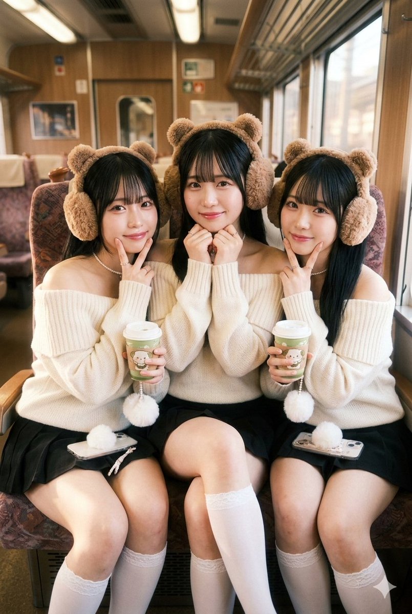 "pose": "Sitting closely together on a train seat, looking at the camera with soft smiles",