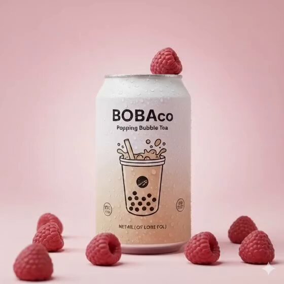 PROMPT - Ultra-realistic studio product photo of a white "BOBAco Popping Bubble Tea" can centered on a smooth pastel pink background, covered with cold condensation droplets. A fresh raspberry placed on the can rim, with multiple ripe raspberries scattered in the foreground. Soft diffused key light with subtle rim light, shallow depth of field, crisp label focus, premium commercial beverage photography, clean minimal aesthetic, 85mm lens look, high-end retouching, no text, no watermark.