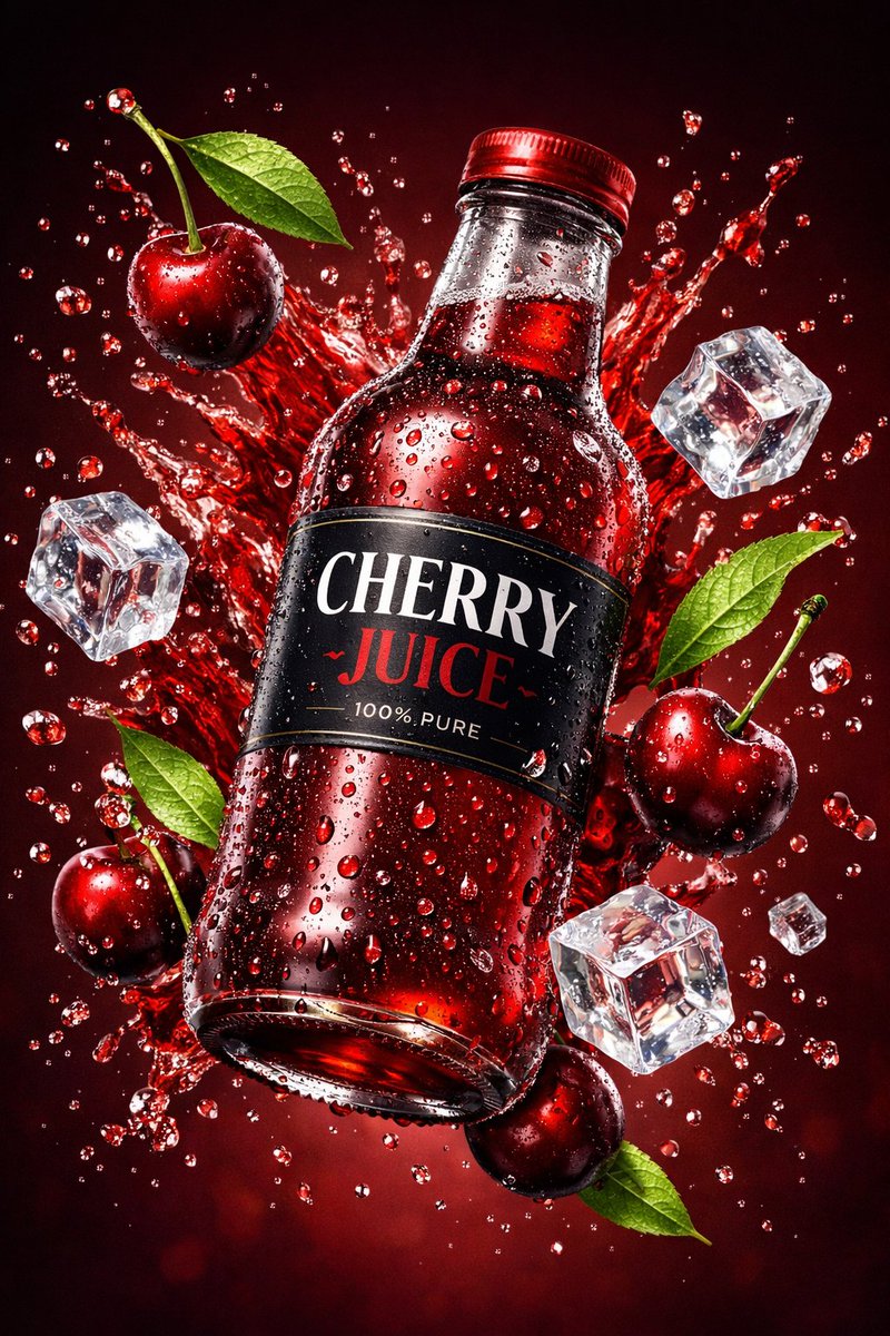 "description": "Ultra-realistic 3D commercial-style product shot of a premium cherry juice bottle suspended mid-air, covered in intricate condensation droplets reflecting ambient light for enhanced photorealism. The bottle appears fresh, vibrant, and slightly tilted for dynamic sophistication. Surrounding elements include high-speed frozen splashes of cherry juice, whole cherries, sharp ice cubes, floating stems, and fresh green leaves — all crisply defined with vibrant clarity. Background features a rich deep red to burgundy gradient evoking indulgence and premium quality. Cinematic studio lighting with bright highlights, crisp shadows, high contrast, and subtle reflective surface beneath the bottle. Label clearly visible with realistic reflections and depth. Overall aesthetic: luxurious, fresh, energetic, high-end commercial beverage advertising.",