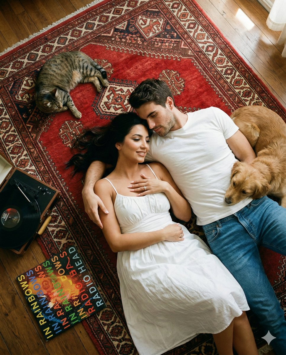 "notes": "Keep the exact top-down camera angle, couple lying position, intimacy, head placement, arm wrapping and overall composition from the reference. Only modify clothing, rug design, and add additional elements naturally."