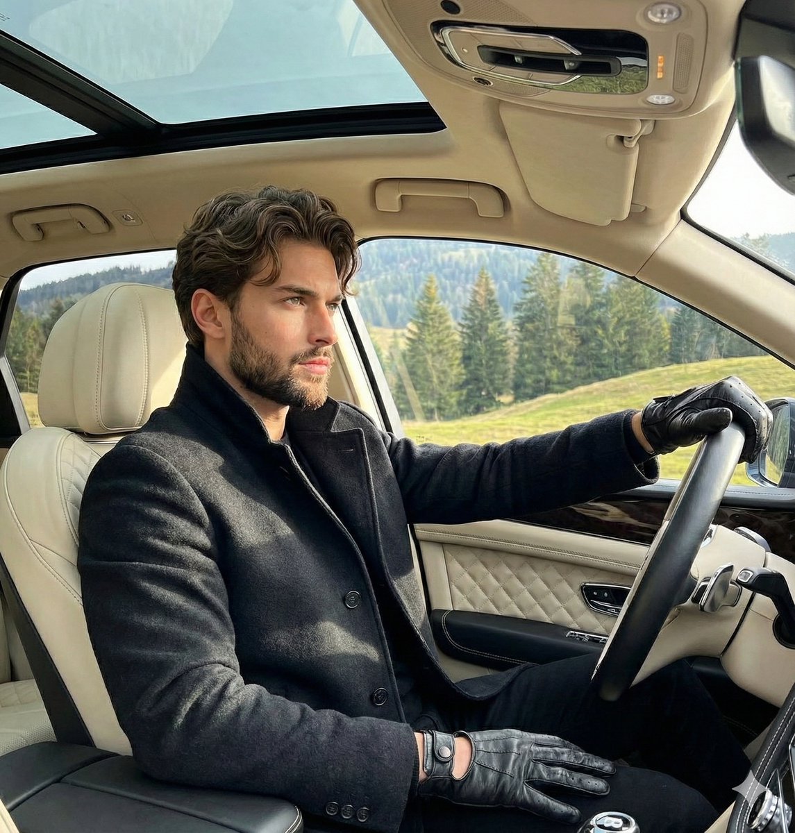 "primary_subject": "Young male model sitting in driver's seat of luxury SUV wearing black coat and black leather gloves",
