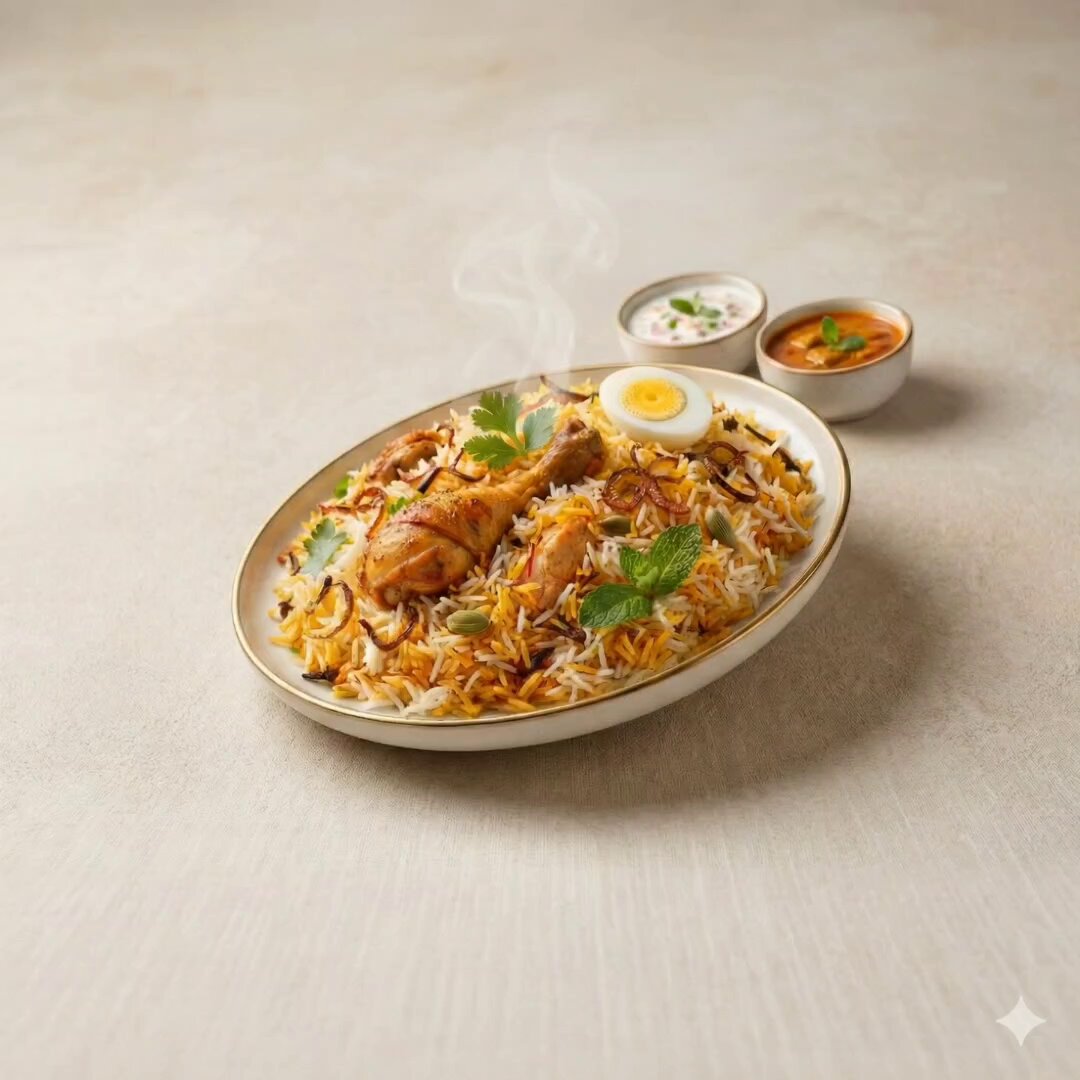 Prompt: “Ultra-clean modern recipe infographic. Showcase briyani in a visually appealing finished form—sliced, plated, or portioned—floating slightly in perspective or angled view. Arrange ingredients, steps, and tips around the dish in a dynamic editorial layout, not restricted to top-down. Ingredients Section: Include icons or mini illustrations for each ingredient with quantities. Arrange them in clusters, lists, or circular flows connected visually to the dish. Steps Section: Show preparation steps with numbered panels, arrows, or lines, forming a logical flow around the main dish. Include small cooking icons (knife, pan, oven, timer) where helpful. Additional Info (optional): Total calories, prep/cook time, servings, spice level—displayed as clean bubbles or badges near the dish. Visual Style: Editorial infographic meets lifestyle food photography. Vibrant, natural food colors, subtle drop shadows, clean vector icons, modern typography, soft gradients or glassmorphism for step panels. Accent colors can highlight key info (calories, prep time). Composition Guidelines: Finished meal as hero visual (perspective or angled) Ingredients and steps flow dynamically around the dish Clear visual hierarchy: dish > steps > ingredients > optional stats Enough negative space to keep design airy and readable Lighting & Background: Soft, natural studio lighting, minimal textured or gradient background for premium editorial feel. Output: 1080×1080, ultra-crisp, social-feed optimized, no watermark.”
