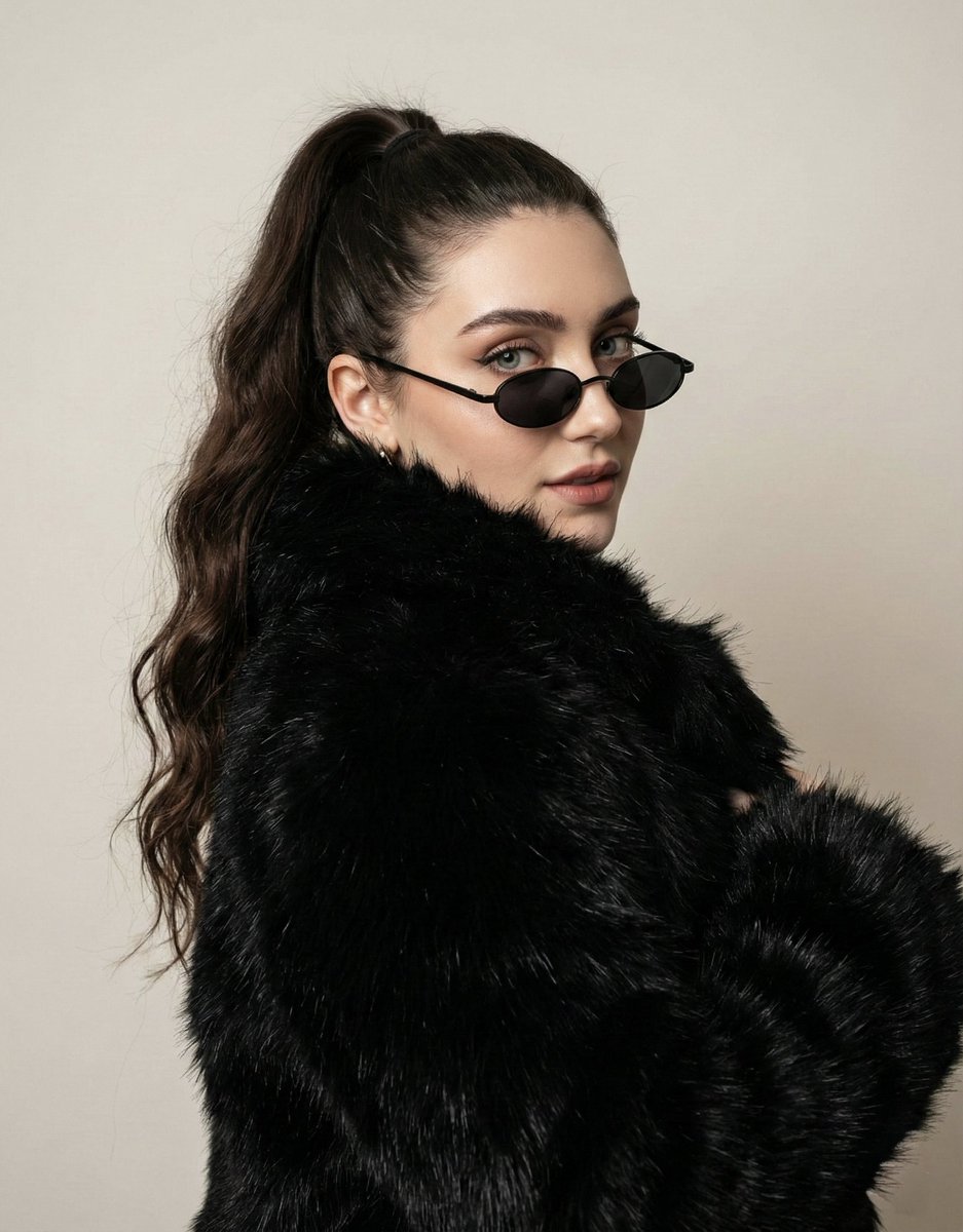 "jacket": "black fluffy jacket covering her shoulders",