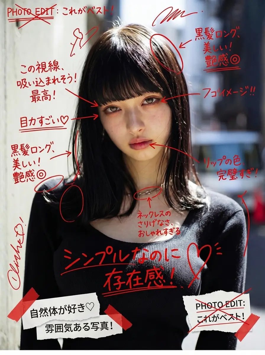 🧩Higgsfield Nano Banana Proプロンプト🍌 画像を自動解析して添削をつける遊び✍️ 使ってみてね🥳 プロンプト Add messy red handwritten Japanese comments, expressive doodles, and energetic editorial-style notes directly on top of the image, as if written with a red marker over printed photos. The handwriting should feel spontaneous, unfiltered, emotional, slightly chaotic, and personal—almost like someone’s private photo journal or annotated scrapbook page. All handwritten text must: – be in Japanese – appear hand-drawn, uneven, casual, and overlapping – be positive in tone The content of each handwritten note must automatically analyze the uploaded image and praise the woman based on what is visible, such as her outfit, expression, pose, styling, makeup, or mood. The comments should feel affectionate, admiring, or supportive, and tailored to what stands out in the photo. Do not repeat generic praise. Instead, generate unique personal compliments that match the image attributes. Examples must NOT be shown explicitly in the prompt. Instead, describe the logic: “The system should observe the clothing style, face, mood, posture, accessories, or color choices and produce handwritten comments that positively highlight what is visually appealing or admirable about her.” Also add: – arrows pointing to notable fashion details – underlines beneath interesting areas – circled elements – crossed-out planning notes like editing marks – layered cut-and-paste collage scraps (magazine style) – small torn paper labels – sticker-like notations – tape-texture fragments Overall direction: Create a visually intense scrapbook-journal composition, filled with affectionate handwriting, red editorial markings, and collage fragments, giving the entire image an emotional and expressive “personal praise commentary” aesthetic. @higgsfield_ai