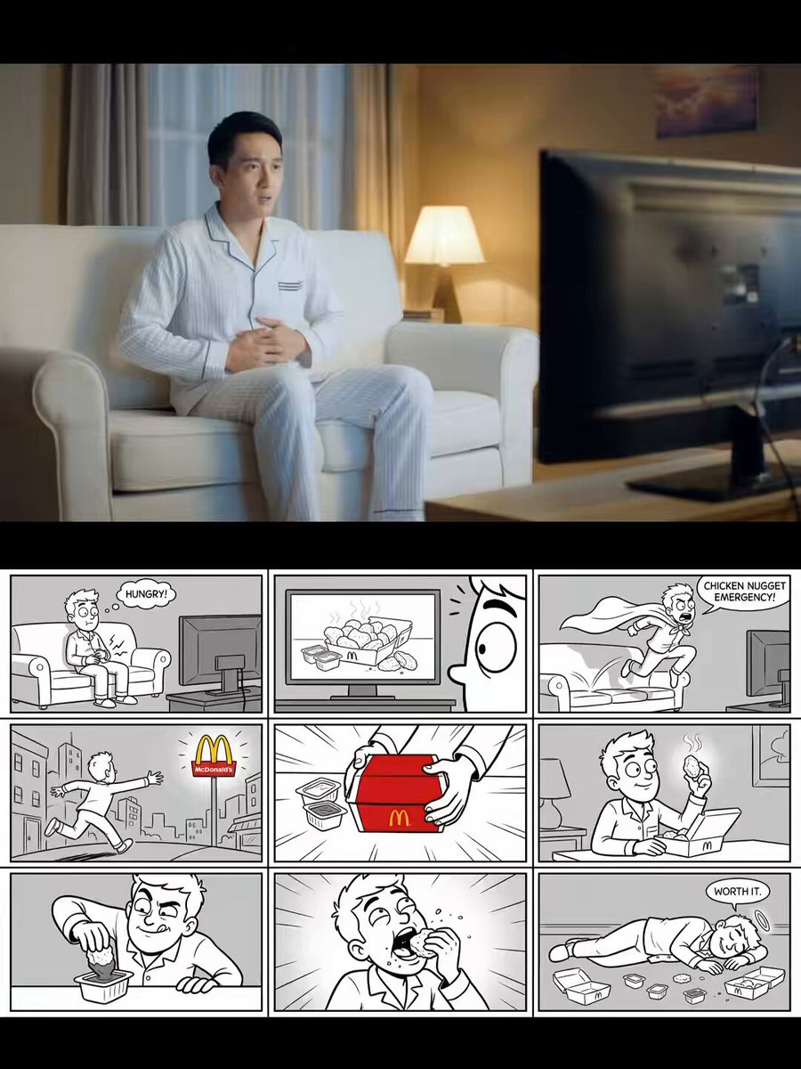 给麦当劳搓了一条小广告,用Nano Banana Pro➕Sora2完全可以做到图生九宫格,九宫格生视频,不需要剪辑和配乐 我把工作流公开了,替换提示语里的主体还可以延伸出漫画版,真人版,汉堡版,海底捞版 (1/9)