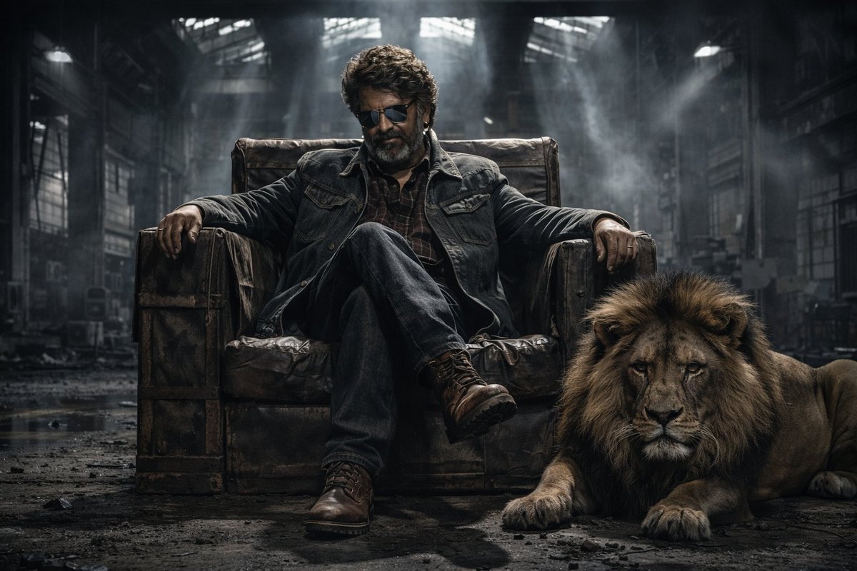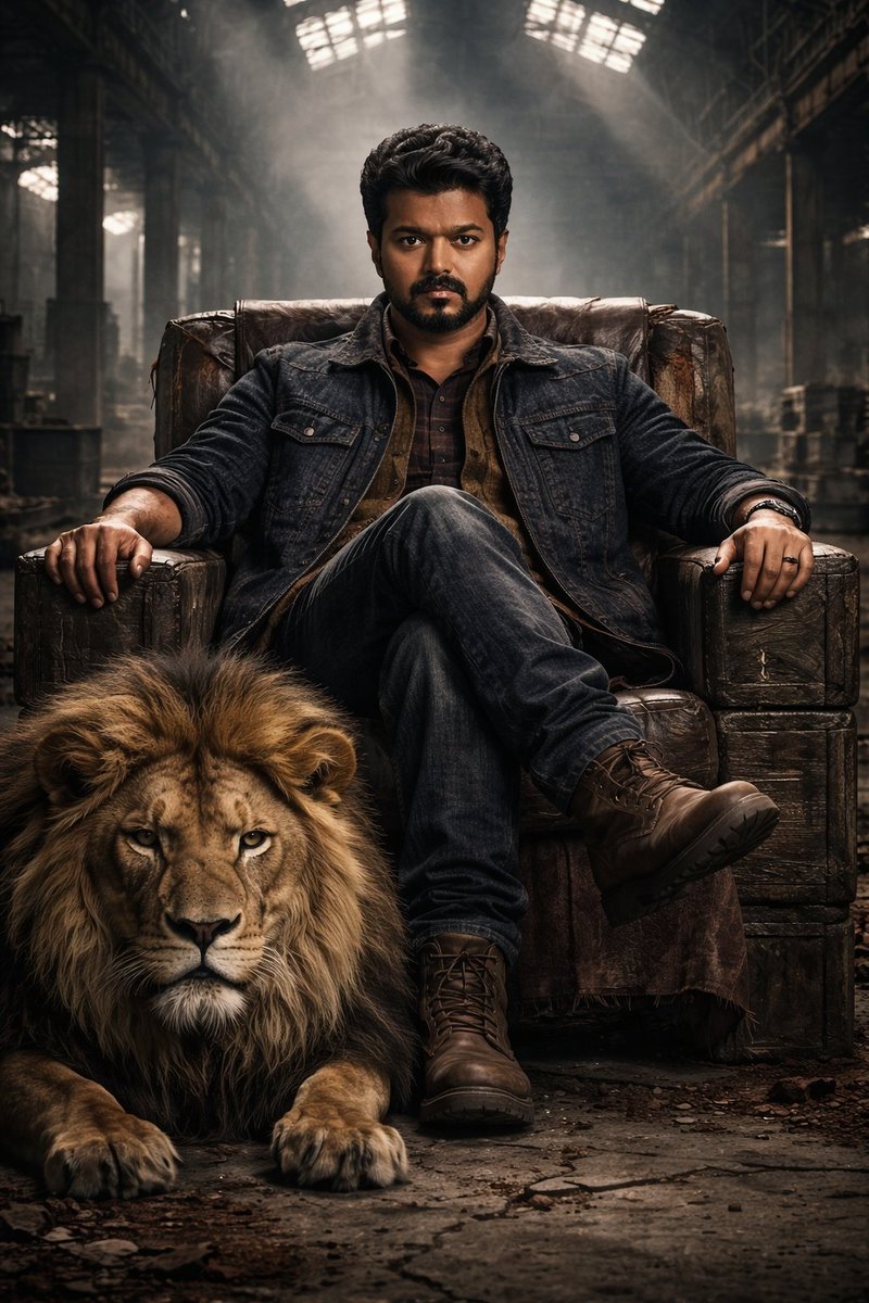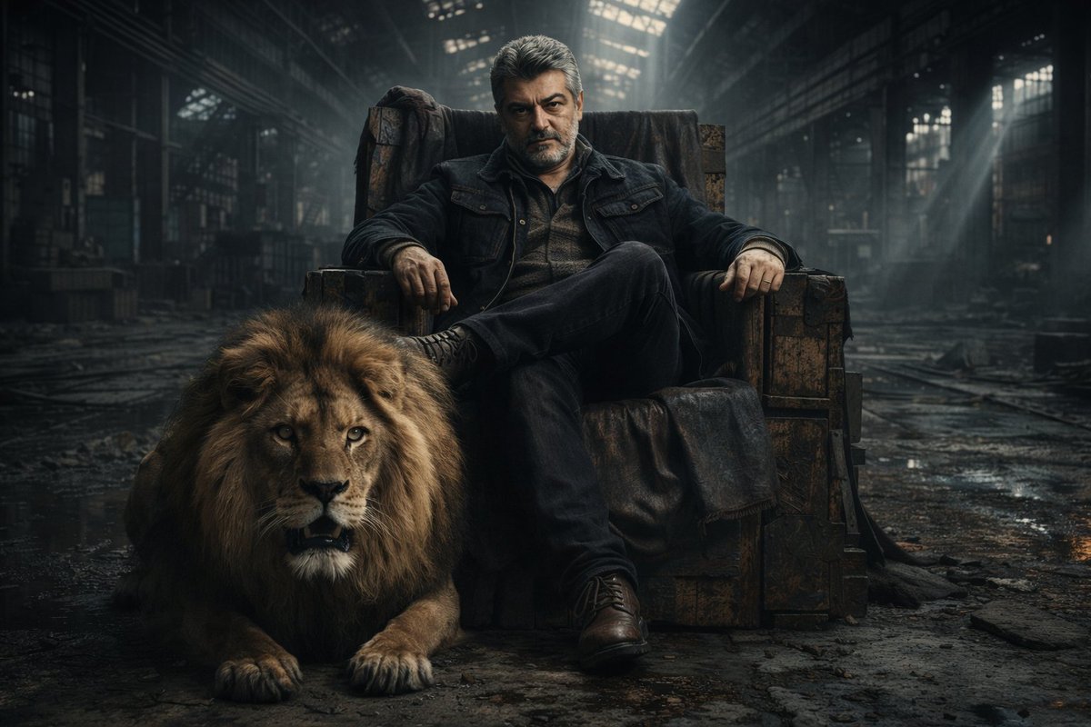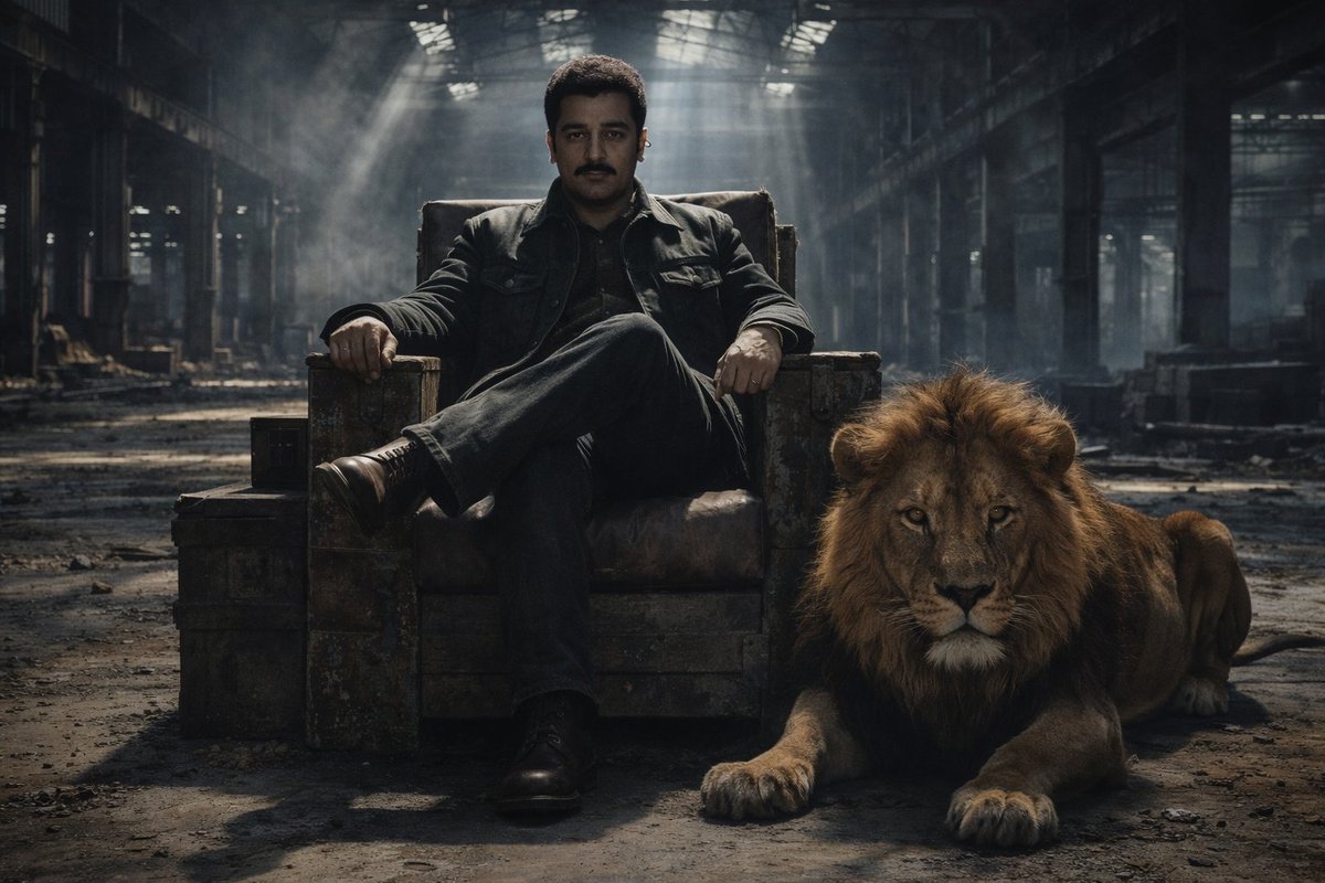 At his feet lies a full-grown male lion, crouched protectively. Unsheathed claws dig into crumbling concrete. Dense mane contrasts sharply with the cold, rusted industrial setting.