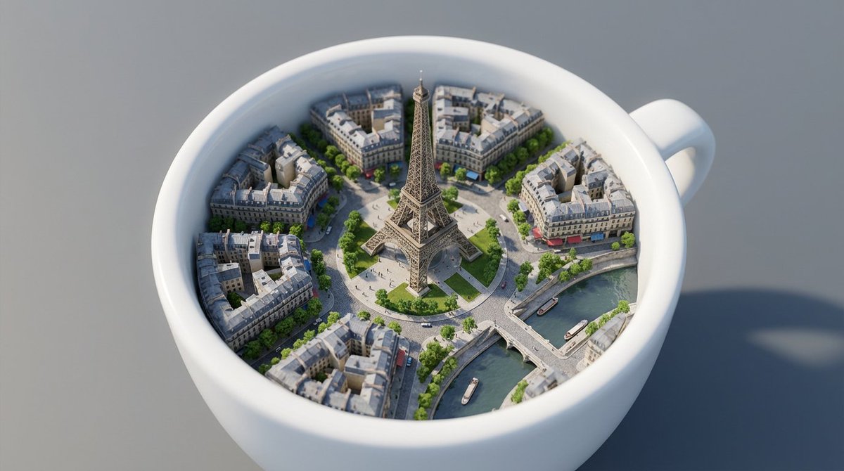 Prompt on Nano Banana Pro : White ceramic coffee cup rests on a smooth gray surface, its interior transformed into a miniature version of Paris. Instead of liquid, the cup contains tiny detailed streets, Haussmann-style buildings with gray rooftops, tree-lined boulevards, and small cafés with awnings. At the center rises a perfectly scaled Eiffel Tower, made of intricate metallic latticework, towering over a circular plaza and grassy park with tiny walking figures. Bridges span across a tiny river resembling the Seine that curves through the cup, with miniature boats floating beneath. The perspective is top-down, with gentle depth-of-field blur at the cup’s edges, focusing sharply on the Eiffel Tower as the focal point. Soft daylight casts realistic shadows, and the city textures—cobblestone streets, glass windows, and greenery—appear ultra-detailed, giving the illusion of a living Paris contained within a cup.