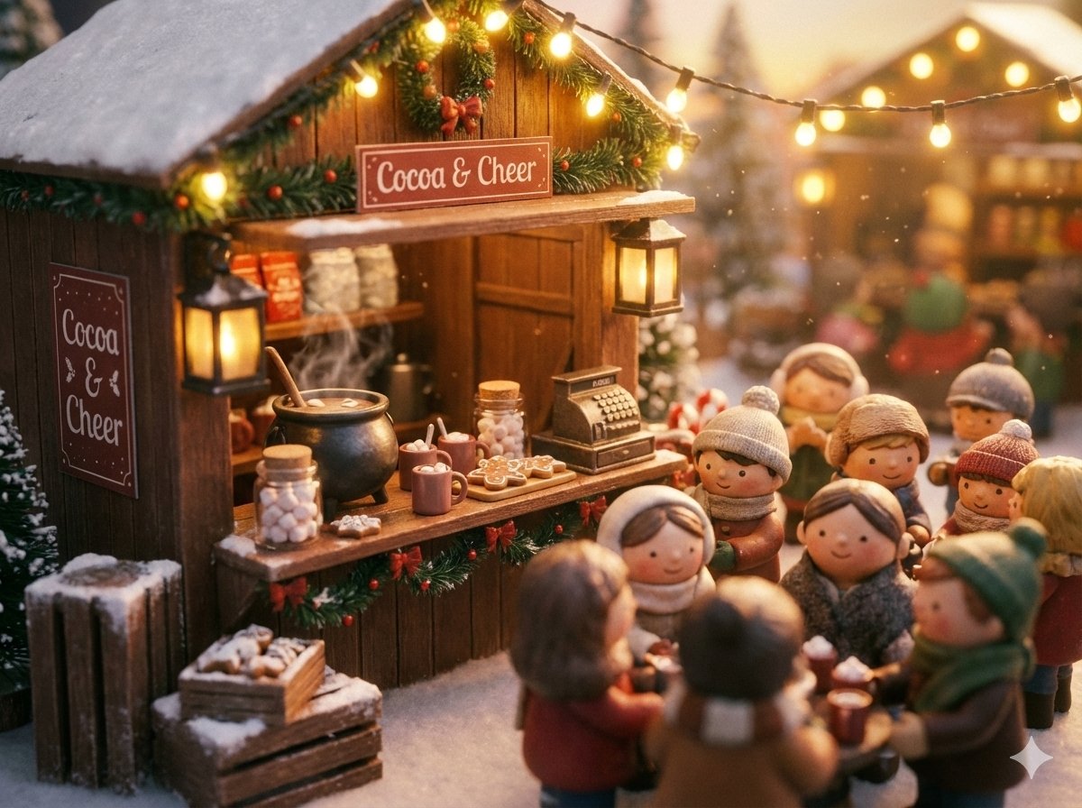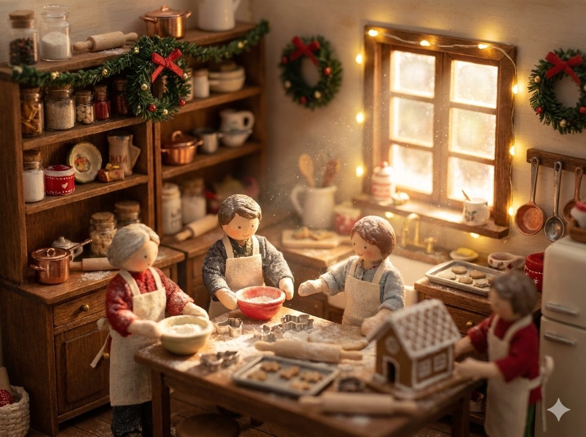 A cozy miniature diorama of [ACTIVITY], tiny handcrafted figures with subtle expressions, meticulously detailed props at 1:87 scale, warm golden-hour lighting casting soft shadows, dust motes visible in light beams, a gentle slice-of-life atmosphere. Tilt-shift photography effect, shallow depth of field, nostalgic and intimate.