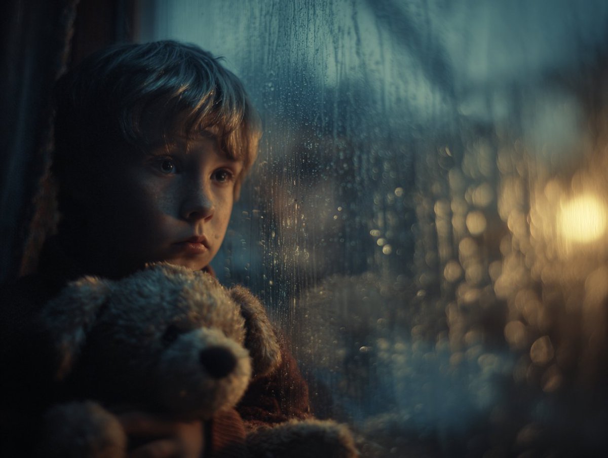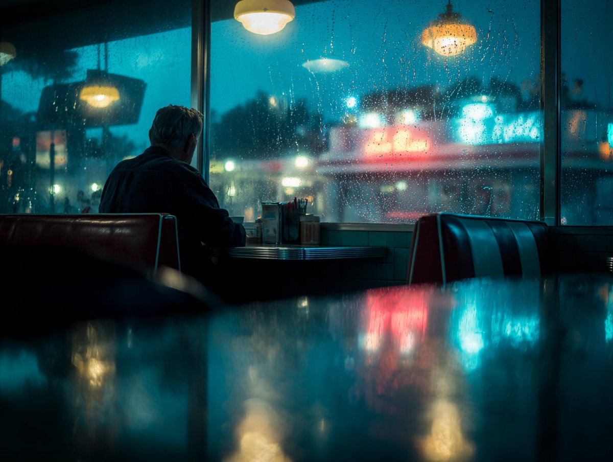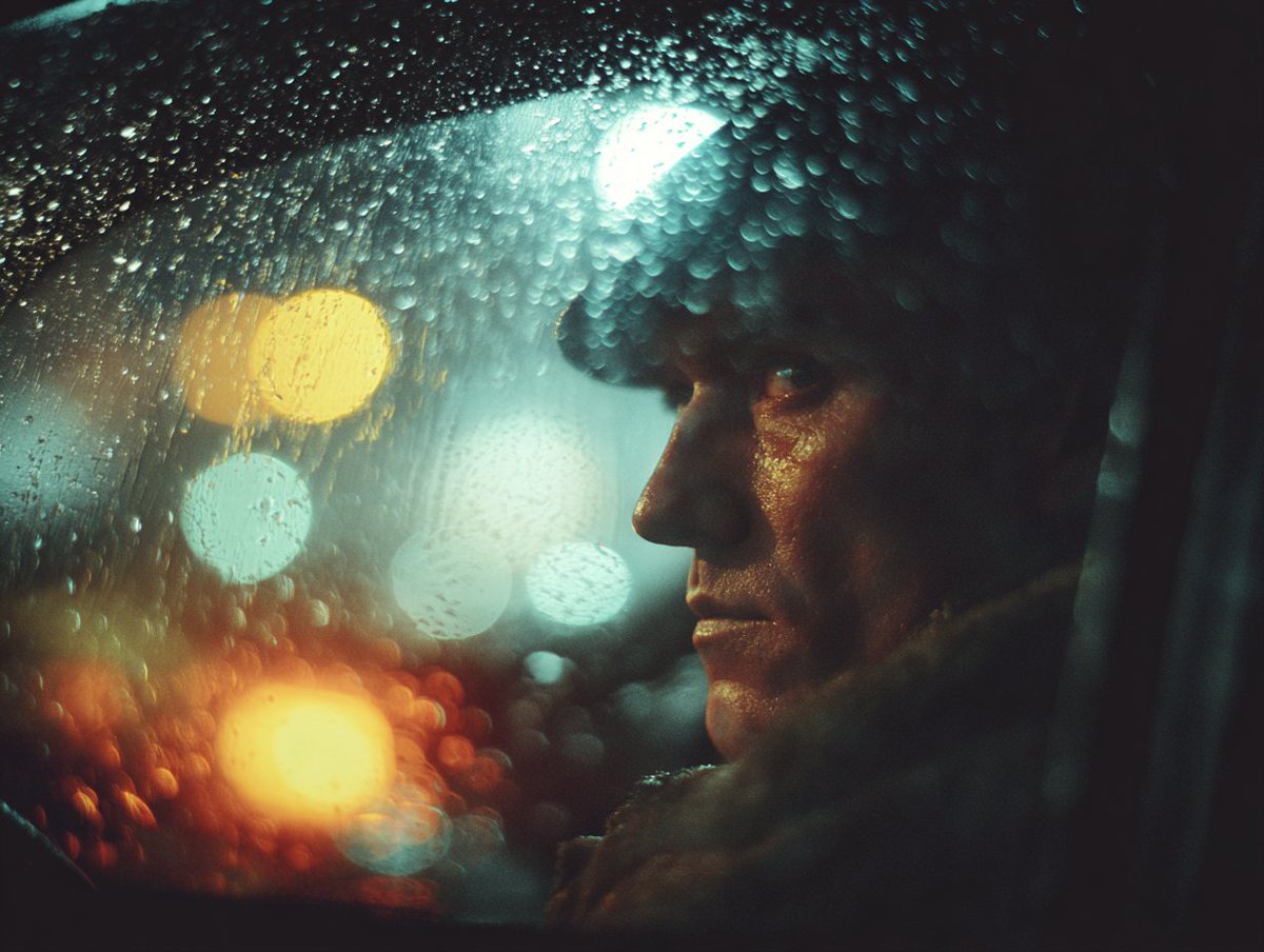 [Subject], profound solitude captured in cinema, hyper-real film still drenched in emotional weight, cold blue hour lighting with dying warmth at the edges, rain-streaked glass creating liquid distortions, shallow depth of field emphasizing loneliness, muted desaturated palette with isolated color accents, slow-motion implied stillness, fine analog grain reminiscent of 1970s existential cinema, lens flares bleeding into darkness, ray-traced reflections in pooling water, breath visible in cold air, negative space dominating the frame, crushing atmospheric pressure, intimate yet distant camera positioning, Vilmos Zsigmond-inspired melancholic cinematography, the weight of unspoken grief.
