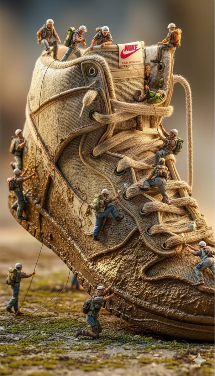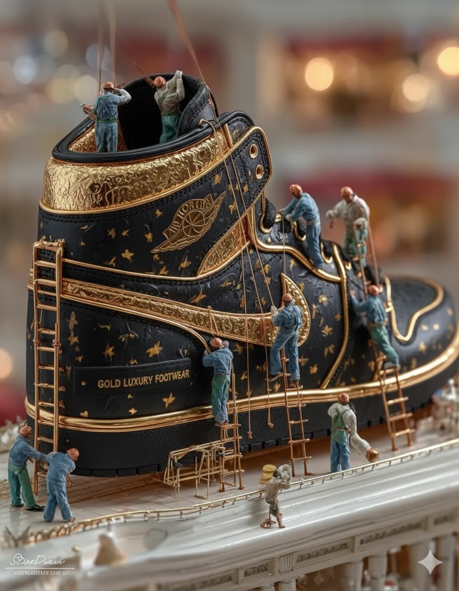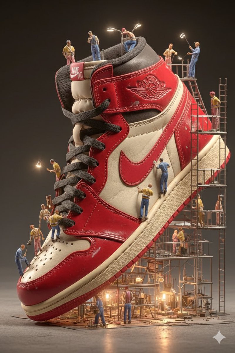 Ai Sneakers Gemini Nano Banana 3.0 Prompt: { "project_title": "Miniature Engineering: The Nike Colossus Series", "global_style_profile": { "aesthetic": "Hyper-realistic, cinematic commercial, macro photography", "rendering_engine": "Octane Render / Unreal Engine 5.4", "color_grading": "High-contrast, professional studio finish" }, "prompts": [ { "scene_id": "monument_aj1_blackout", "concept": "The Air Jordan 1 as a sacred architectural monument.", "visual_description": { "subject": "A massive, towering Air Jordan 1 sneaker standing vertically like a skyscraper.", "characters": "Dozens of tiny engineers and designers in high-visibility gear, utilizing intricate industrial scaffolding to access the upper collars.", "actions": "Workers using miniature spray-paint rigs on the panels, laser-leveling the swoosh, and using heavy-duty sewing machinery on the leather seams.", "environment": "Void-like black studio background to emphasize the scale and texture of the sneaker.", "lighting": "Dramatic rim lighting, cinematic shadows, and sharp studio spotlights highlighting the premium leather grain." }, "technical_parameters": { "aspect_ratio": "2:3", "stylize": 250, "detail_level": "Ultra-detailed textures, 8k resolution, creative surrealism" } }, { "scene_id": "luxury_mall_assembly", "concept": "High-end retail craftsmanship on a microscopic scale.", "visual_description": { "subject": "An enormous, glossy designer sneaker with rich textures and premium finishes.", "characters": "Miniature assembly crews climbing the sneaker like a construction site; some are using ropes to hoist the 'Nike' logo into place.", "environment": "Inside a luxury shopping mall with soft, blurred background store lights and marble flooring.", "lighting": "Warm gold and deep black color palette, soft-box lighting, realistic glossy reflections on the sneaker’s surface.", "camera_motion": "Simulated slow vertical camera pan with a cinematic shallow depth of field." }, "technical_parameters": { "aspect_ratio": "4:5", "stylize": 750, "vibe": "Elegant, sophisticated, hyper-realistic animation style" } }, { "scene_id": "macro_mountaineer_aj1", "concept": "Extreme macro view of maintenance on a red-and-white icon.", "visual_description": { "subject": "Extreme close-up of a giant Red and White Air Jordan 1 resting on sun-drenched concrete.", "characters": "One-inch-tall workers sunlight hitting the red leather panels, creating natural lens flares and warm, long shadows." }, "technical_parameters": { "camera_spec": "Virtual ARRI Alexa with a 100mm Macro Lens", "aesthetic": "Nike professional advertising campaign aesthetic", "quality": "Hyper-realistic 4K, shallow DOF (Depth of Field)" } }, { "scene_id": "warehouse_sole_maintenance", "concept": "Industrial-scale cleaning of a pristine classic.", "visual_description": { "subject": "A colossal, pristine white Nike Air Force 1 occupying a warehouse floor.", "characters": "Miniature maintenance crew in orange safety vests; a team is pressure-washing the tread of the sole while another group uses toothbrush-sized tools to scrub the stitching.", "environment": "Smooth warehouse floor with atmospheric haze and wide industrial windows.", "lighting": "Side-lit by soft daylight, creating realistic volume and highlighting the 'Triple White' leather texture." }, "technical_parameters": { "aspect_ratio": "9:16", "resolution": "4K Realism", "mood": "Cinematic commercial tone, crisp and clean" } } ] }