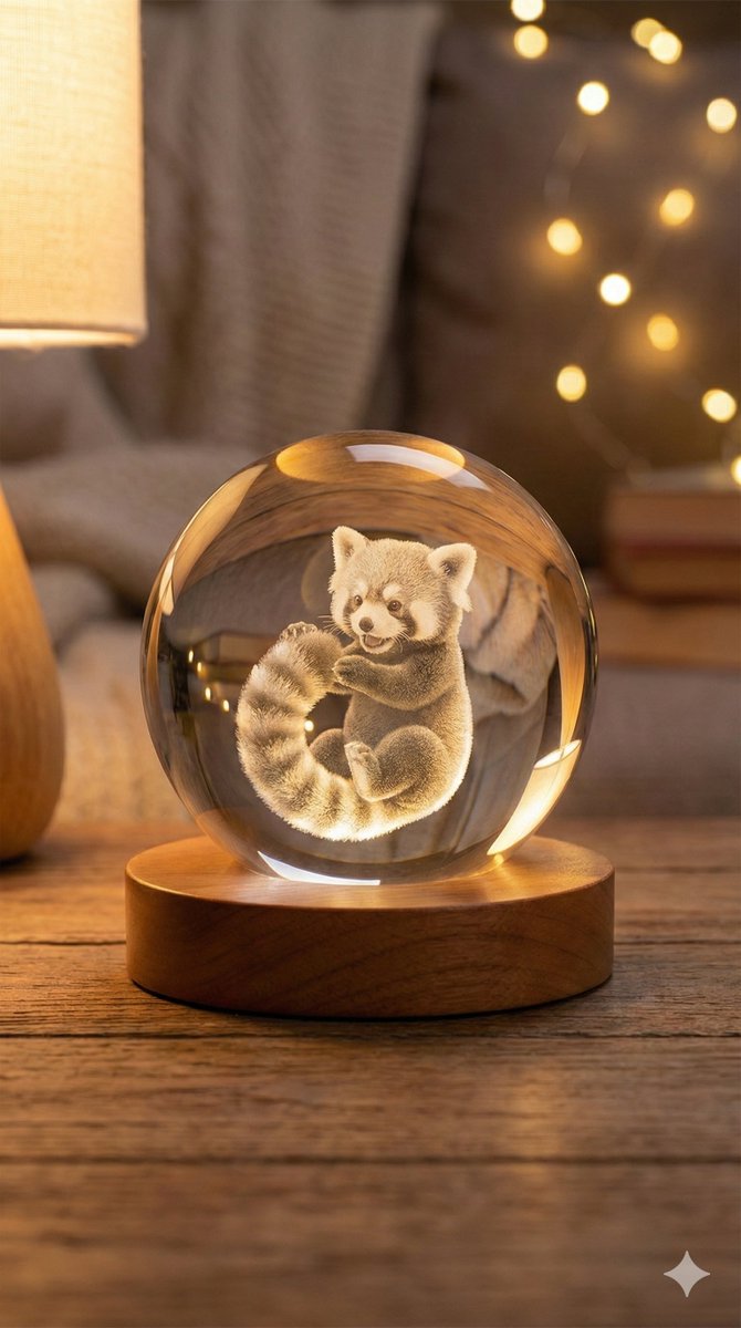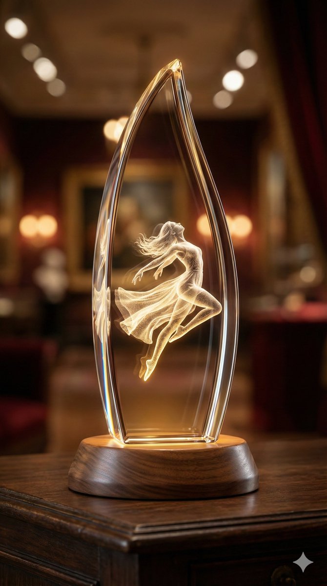 Lighting Interaction: The engraving must "glow brilliantly from within," illuminated entirely by warm, golden LED light originating from the base beneath it.