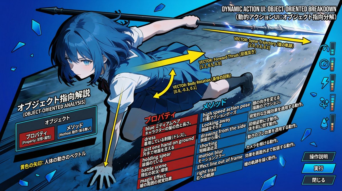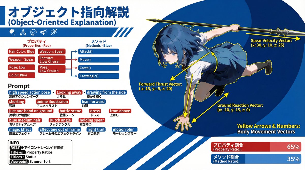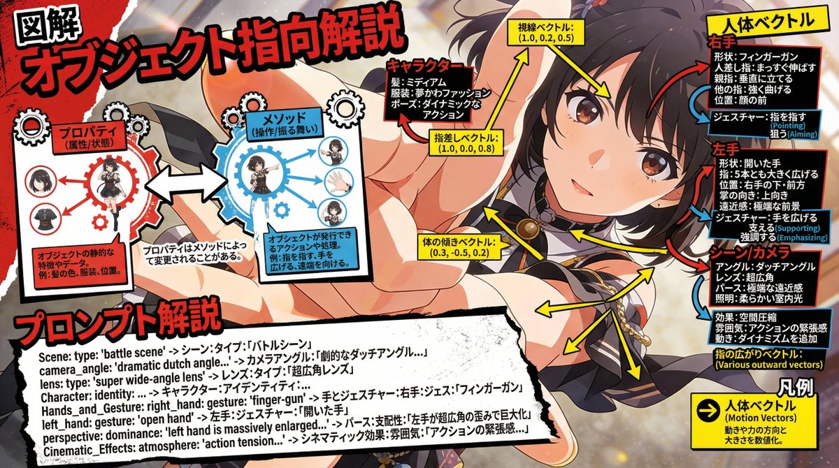 解剖するぞ!プロンプト! ブクマ保存おすすめだよ! 情報商材屋は私に1000億円払ったら使ってもいいよw seedream4.5で生成したキャラクターをNano Banana Proで解説画像にアレンジっ!! 今回、話したいのは画像生成するときのプロンプトの考え方についてです。 実は、だいぶ前に「べこくり」で話をした内容です。 べこくりの皆さんはアーカイブを見てみて🥺 私が画像生成のプロンプトを作るときは 「オブジェクト指向」を用いています。 オブジェクト指向?なにそれ?と思ったら画像を見てください。 特徴とどこがそれに該当するのかおしゃれに解説しています。 黄色のベクトルはプロンプトには関係ないのでスルーしてください。ただ力のかかる方向性など、プロンプトを作る上での人体の可動範囲がわかるかも?だから眺めるくらいはしてもいいかも。 ちなみに、この図解の作り方の方が気になる感じですかね…これは後日どれか一つは公開します☺ 楽しみにしててね! 今は全部で解説UIプロンプトが3つできました。 あとの2つはさすがにnoteに流しておこうかなと思います。