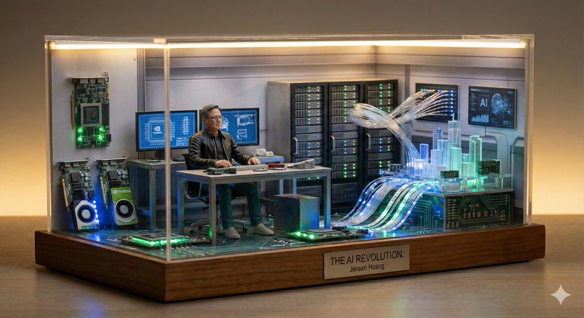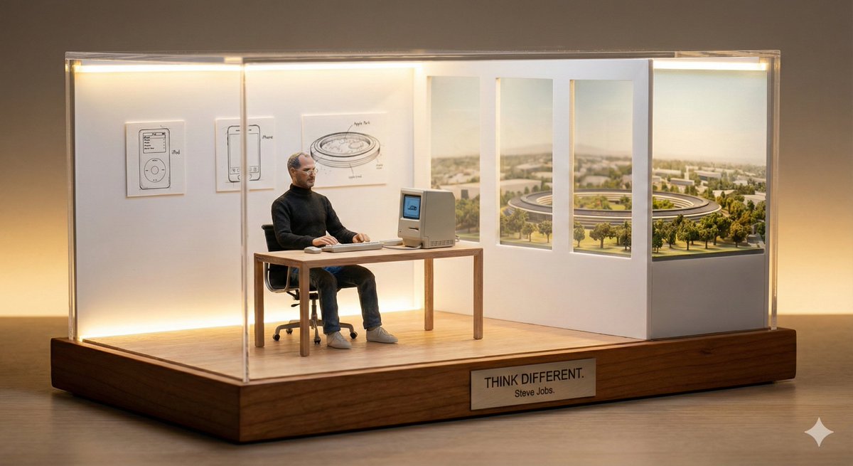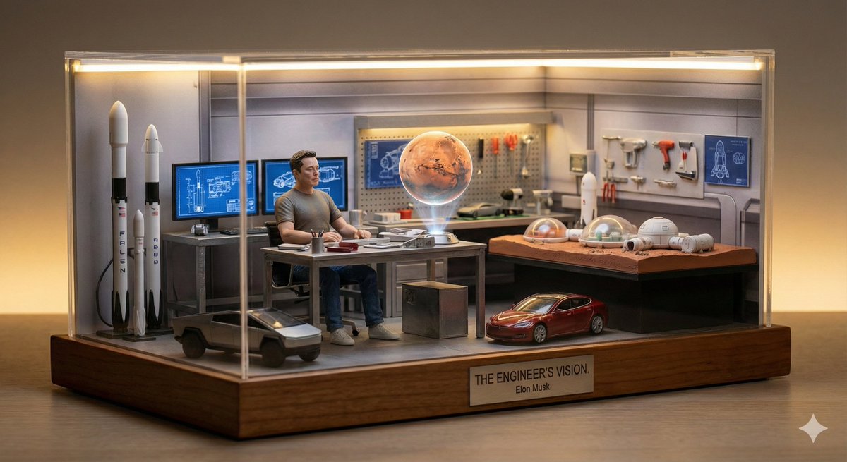 A miniature diorama of [BUSINESS LEADER] inside a symbolic workspace representing their vision. Tiny desk, screens, city models, warm ambient lighting.