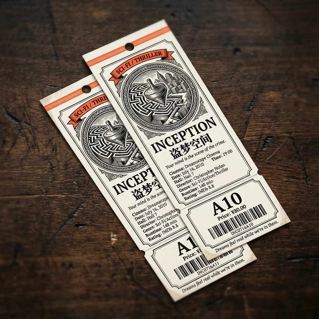 生成电影票。 🍌 Nano Banana Pro prompt : 电影名称:[盗梦空间] 请生成一张复古风格电影票据的真实照片,要求如下: 场景 两张票据略微重叠摆放在深色木质桌面,俯视拍摄,柔和自然光,浅景深。票据完全平放,顶部票据覆盖底部约55%并旋转几度。专业产品摄影美学。 材质 200g米黄色艺术纸,亚麻纹理,哑光表面。竖版书签比例(约5cm×17cm)。票据2/3处有微穿孔撕裂线(细密打孔),上部为主票,下部为可撕票根。 设计结构 顶部:橙色装订孔连线装饰 主票区(穿孔线以上): 类型标签横幅 核心视觉插画(黑白木刻版画风格,高度概括电影主题,装饰性边框,细节丰富) 电影中英文标题 经典台词/tagline 详细放映信息(影院、日期、时间、影厅、导演、类型、时长、评分) 穿孔撕裂线(细密虚线) 票根区(穿孔线以下): 座位号(两张票显示相邻座位) 票价 票号流水码 条形码 底部装饰quote 印刷 纯黑油墨(#000000)+ 橙色强调(#FF6B35)印在米黄纸上(#F5EFE7)。高质量胶版印刷质感,油墨略有渗入纸张纹理。 核心要求 根据电影自动设计符号化视觉元素,匹配电影气质和类型 所有信息(导演、时长、台词等)需真实准确 高信息密度,装饰元素丰富,无大面积空白 照片呈现真实生活场景,适合社交分享 高级收藏品质感 输出:一张专业摄影照片,两张重叠的复古电影票据,自然光线,木质桌面。