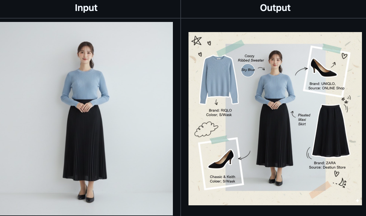 A fashion mood board collage. Surround a portrait with cutouts of the individual items the model is wearing. Add handwritten notes and sketches in a playful, marker-style font, and include the brand name and source of each item in English. The overall aesthetic should be creative and cute.