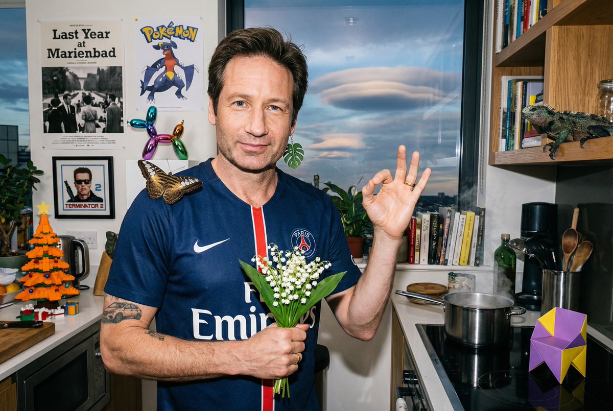 Y'all aren't pushing Nano Banana Pro hard enough. > A portrait photo of david duchovny, he is wearing a PSG kit, on his shoulder is a parthenos sylvia, in his hand he is holding lily of the valley, behind him there is a poster for the movie "Last Year at Marienbad" and a Garchomp poster. On a plinth there is a jeff koons sculpture. The sky through the window shows lenticular clouds. There is also a Terminator 2 cross-stitch on the wall. On his arm there is a tattoo of a Nissan Qashqai. There's an orange lego Christmas tree. The room has a high end decor, a pot is boiling on the NEFF hob. Next to the pot is a little origami chair made from purple and yellow paper. He has a dangling monstera leaf earring. There is a pet marine iguana. In his other hand he is making the ok shape. On that hand there is a gold ring. The whole image gives the impression of a hastily taken photo, an everyday scene.