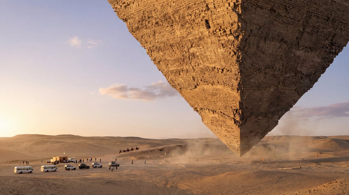 Prompt on Nano Banana Pro: Photorealistic ultra-wide desert scene in Egypt near the Giza plateau at golden hour. A colossal inverted pyramid, point-down, dominates the landscape at an unimaginable scale, dwarfing the horizon. Its vast upper rim stretches for multiple kilometers, while the sloping faces plunge inward toward a needle-like apex that hovers just above the sand, leaving a gigantic shadowed void beneath. The surface reads as ancient limestone blocks with dark granite inlays: mega-sized courses, eroded edges, wind-sanded wear, and long, faint bands of hieroglyphs that only appear where the sun grazes the stone. Include tiny scale cues in the distance: a thin line of tourists like ants, a few small buses and 4x4s parked far away, a camel caravan crossing the flats, and scattered survey flags. Heat haze and dust plumes soften the far edges. Sand dunes climb the lower planes where stone meets desert, with drifting sand spilling down seams like a slow waterfall. Pale sky, low sun, strong raking light, extreme HDR realism, crisp micro-textures, natural color grading, no glow or energy effects.