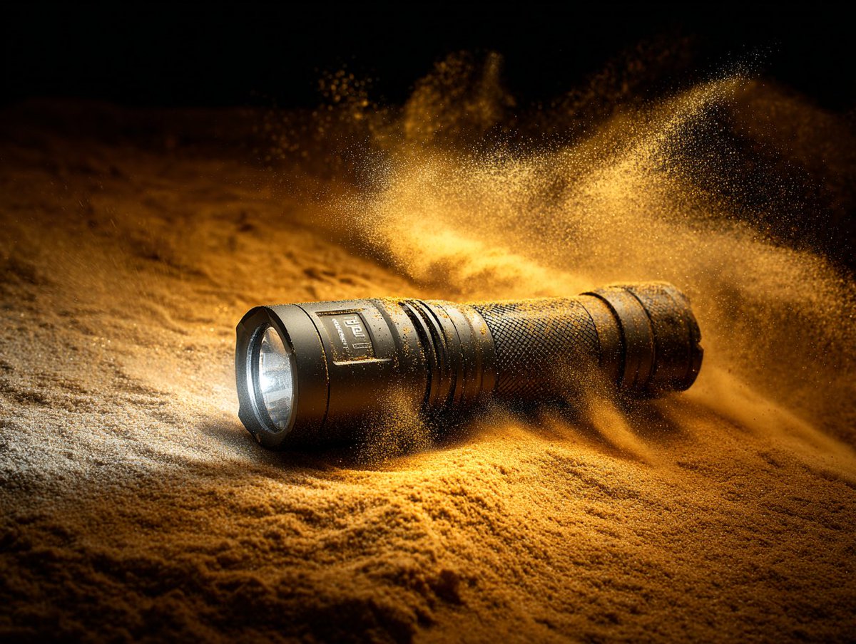 [PRODUCT] with fine sand particles swirling around it, caught mid-motion, desert wind effect, warm golden lighting, gritty texture contrast, elemental power, rugged durability implied, dynamic studio capture.