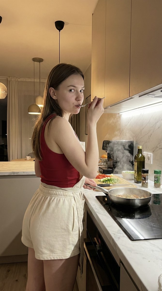 Cooking dinner. Getting watched. Gemini Nano Banana Pro {   "meta": {     "aspect_ratio": "9:16",     "quality": "ultra_photorealistic",     "resolution": "8k",     "camera": "smartphone rear camera",     "lens": "35mm",     "style": "candid lifestyle shot, natural skin texture, high realism"   },   "scene": {     "location": "modern apartment kitchen",     "setting": "marble countertop, induction stove, cutting board with vegetables, warm wooden cabinets",     "time": "evening",     "atmosphere": "cozy, intimate, home-cooking energy"   },   "lighting": {     "type": "warm indoor kitchen lighting",     "source": "overhead pendants + soft under-cabinet lights",     "effect": "gentle highlights on skin, soft shadows, cinematic warmth"   },   "camera_perspective": {     "pov": "third-person (someone else is filming)",     "angle": "slightly low, over-the-counter angle",     "distance": "about 1.5 meters",     "framing": "mid-thigh to head",     "motion": "subtle handheld realism"   },   "subject": {     "gender": "female",     "age": "early 20s (clearly adult)",     "ethnicity": "random european / mixed",     "body": {       "type": "extreme hourglass",       "waist": "very slim",       "hips": "very wide and round",       "ass": "full, lifted",       "legs": "thick thighs",       "posture": "relaxed with a natural arch while cooking"     },     "skin": {       "tone": "very pale porcelain white",       "detail": "natural texture, soft glow"     },     "hair": {       "color": "dark blonde",       "length": "long",       "style": "straight, sleek",       "behavior": "tucked behind ears, falling down the back"     },     "face": {       "eyes": "clear light blue",       "expression": "focused but playful side glance toward camera",       "lips": "slightly parted, soft pink",       "vibe": "effortless, confident, magnetic"     },     "action": {       "activity": "cooking at the stove",       "details": [         "stirring a pan",         "tasting sauce with a spoon",         "casual hip shift while reaching for seasoning"       ]     },     "outfit": {       "top": {         "type": "fitted ribbed tank",         "color": "cherry red",         "fit": "tight, cropped just above waist, no bra",         "fabric": "soft cotton rib, lightly clinging"       },       "bottom": {         "type": "high-waisted lounge shorts",         "color": "cream",         "fit": "short, snug, curve-hugging"       },       "accessory": {         "item": "simple kitchen apron",         "state": "loosely tied at waist, sitting low on hips",         "effect": "frames curves without hiding them"       }     }   },   "details": [     "steam rising from pan",     "knife marks on cutting board",     "olive oil bottle and spices nearby",     "natural candid moment, not posed",     "instagram model realism"   ] }
