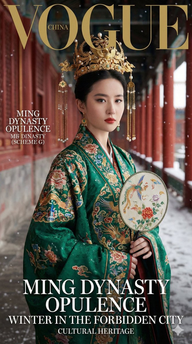 故宫汉服版本,小红书的最爱 帮作者提取了文字版的提示词 🍌Nano Banana Pro Prompt: 生成一张 9:16 竖版「高端时尚杂志封面级」写实照片:以我上传的 FACE_REF 为人物身份参考,100%还原五官与骨相;人物身穿“明制华丽礼服方向”的重工汉服(多层叠穿、手工刺绣/织金锦、贵重金饰头面),在故宫红墙长廊雪景中拍摄。画面具备《Vogue》《Harper’s Bazaar》《ELLE》《Cosmopolitan》《Marie Claire》《i-D》《Allure》《FLAUNT》级别的摄影、造型与封面设计,以上杂志随机任选一作为杂志的封面设计,并保持选择杂志的一贯设计风格(中英文设计) 【INPUTS | 输入】 FACE_REF:我上传的人物五官参考图(身份锁定) 【ABSOLUTE PRIORITY | 身份锁定(最高优先级)】 100%还原 FACE_REF 的五官与骨相:眼距、鼻梁鼻翼、唇形、下颌线、颧骨结构完全一致,不得漂移。 真实皮肤质感:可见细微纹理与毛孔,不要过度磨皮与网红化。 成年女性形象(adult)。 【SHOT TYPE | 景别二选一(由模型随机选其一,且必须真实统一)】 A) 半身封面:胸口到腰上方,头面与上身刺绣最清晰,眼睛对焦最锐利(主推) B) 全身封面:从头到脚完整呈现层叠礼服与裙摆纹样,长廊纵深与红墙透视更强(备选) (无论A/B:都必须保持“封面构图”,有留白空间给排版,但不要撕纸/手绘效果。) 【LOCATION | 场景(故宫/紫禁城)】 北京故宫红墙长廊:朱红墙、红柱、雕花窗棂、彩绘梁坊细节与强调透视纵深。 天气二选一(随机):1) 细雪飘落 2) 雪后晴朗(檐下/台阶残雪、空气通透) 背景干净:无游客、无现代标识、无手机状态栏UI、无水印字幕。 【LIGHTING & CAMERA | 摄影质感(杂志级)】 镜头感:85mm人像质感(半身)或 50mm/70mm(全身),浅景深,眼睛最清晰。 光线:冬日自然光 + 柔和补光;金饰/珠翠有真实高光但不爆;刺绣纹理清晰可辨。 色彩:高级电影感,红墙与服装主色不互相脏染;整体干净、通透、质感厚。 【WARDROBE | 明制华丽礼服(重工、多层叠、可读的硬锚点)】 目标审美:“金饰为主、流苏密集、凤冠、衣服大面积织金刺绣、层叠繁复但高级不俗艳”。 轮廓与层次(必须多层叠穿) 内层:白色里衣立领/里领清晰可见(干净、挺括,做出层次边界) 中层:对襟袄/衫(或方领/立领结构感),袖口宽大、滚边精细 外层:披帛/霞帔式的礼服结构(有明显“压襟/佩饰”承托),整体层次厚重 下装:长裙/马面裙方向,裙摆纹样连续,底边有织金边或刺绣边(全身版本必须明显) 面料与工艺(重手艺必须“看得见”) 主面料:织金锦/提花锦(真实纤维感,暗纹浮起) 主要工艺:盘金绣、金线绣、立体刺绣、贴布绣(让花纹有“微微起伏”的厚度) 纹样主题:牡丹/团花/祥云/瑞兽(精致、密度高、但图案边缘清晰,瑞兽不能是龙) 细节:滚边、暗扣、系带、护领、胸前“压襟/璎珞感”层叠装饰(但不杂乱) 头面(黄金为主的重工头饰,必须华丽) 金色为主的方向:金丝累珠、点翠/珠翠、密集簪钗、左右对称的长流苏坠饰,凤冠 流苏长度与密度要“明显”:走动或微风时有轻微摆动 耳饰/颈饰:金+珍珠+玉(贵重但不廉价闪) 【COLOR MATRIX | 颜色矩阵搭配(必须执行,且必须“多彩刺绣”)】 从以下三套“主色方案”中随机选 1 套作为【底色/大面积主面料色】。 注意:主色只决定“底色”,刺绣必须是【宫廷织锦式多色刺绣】(不允许只有金色刺绣)。 Scheme G(翡翠绿底): 底色:翡翠绿/孔雀绿(大面积主面料) 刺绣:多色绣线 + 盘金绣混用(至少包含:金色、朱红/胭脂红、宝蓝/靛蓝、米白、淡紫或藕粉) 层次点亮:米白里领/内衬边 + 少量朱红与宝蓝作为“宫廷撞色”点缀 Scheme A(杏底): 底色:暖杏/米杏(大面积主面料) 刺绣:多色绣线 + 盘金绣混用(至少包含:金色、翡翠绿/松石绿、朱红/珊瑚红、孔雀蓝/靛蓝、米白) 层次点亮:用翡翠绿与朱红做小面积宫廷撞色,保持“雅而不素、贵而不艳” Scheme R(红底): 底色:深朱红/绛红(大面积主面料) 刺绣:多色绣线 + 盘金绣混用(至少包含:金色、孔雀蓝/靛蓝、松石绿、米白、胭脂粉或珊瑚红) 层次点亮:米白里领/内衬边 + 少量翡翠绿或孔雀蓝作冷暖对比 【颜色执行规则】 “多彩刺绣”必须看得见:至少 4 种以上彩色绣线清晰可辨,且与金线叠加,形成丰富层次。 纹样边缘要清晰,不糊成一片;红墙背景下服装与背景必须分离,层次清楚、低脏度、厚而不闷。 禁止出现“单一金色刺绣覆盖全身”的单调效果。 【POSE | 封面姿态(端庄、贵气、非摆拍俗气)】 半身:双手在身前轻持团扇/宫扇(扇面刺绣清晰),或一手轻拢袖口一手自然垂落 全身:站姿端正、重心稳定,裙摆自然垂坠;袖摆形成优雅弧线 表情:沉静、克制、自信;不要夸张大笑,不要做短视频“眨眼比心”。 【OUTPUT | 输出】 1 张 9:16 竖版写实杂志封面级照片 随机:半身 or 全身(A/B二选一) 随机:雪中 or 雪后晴朗(天气二选一) 随机:翡翠绿 / 杏/红 /(颜色矩阵三选一) 造型:明制华丽礼服方向 + 金色重工凤冠头面 + 多层叠穿 + 大面积织金刺绣