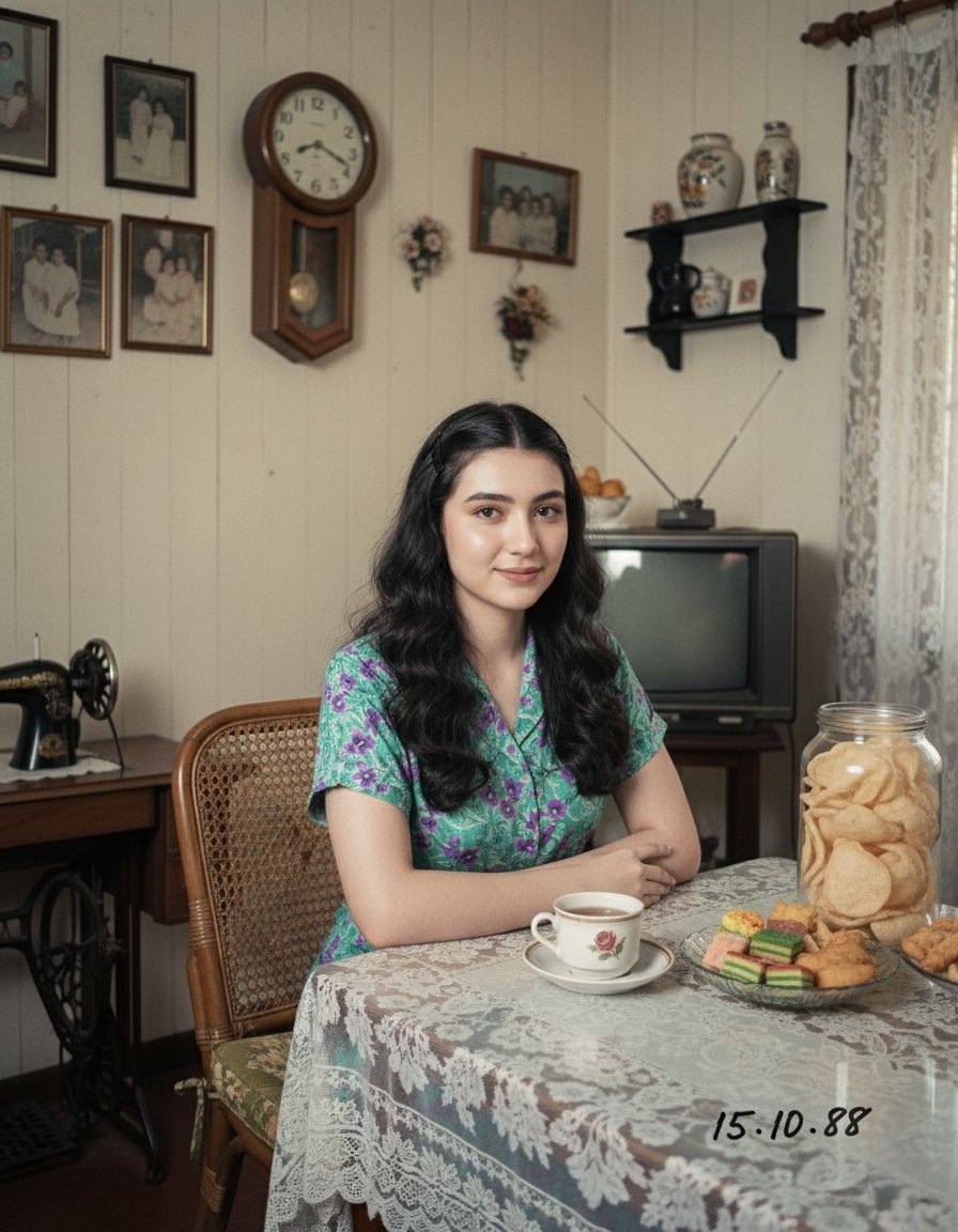 "background": "A warmly lit 1980s Indonesian family kitchen captured with soft analog focus.",