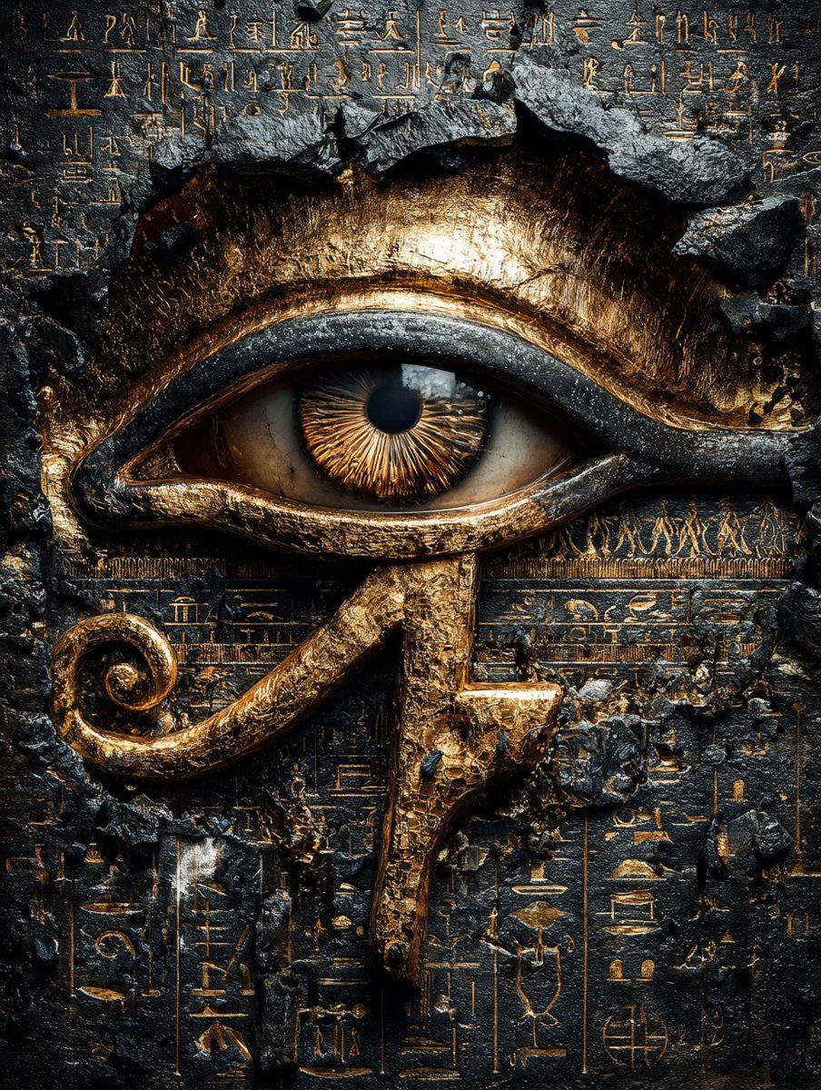 an ancient Egyptian hieroglyphic symbol of the eye, placed on an old black stone wall with many other symbols and writing all around it. the background is dark gray, and there's a golden glow coming from behind the eye, giving off a mystical feel to the scene. there should be no text or letters in front of the eye of Horus, just a simple ancient art style.PROMPT TO ART GA an ancient Egyptian hieroglyphic symbol of the eye, placed on