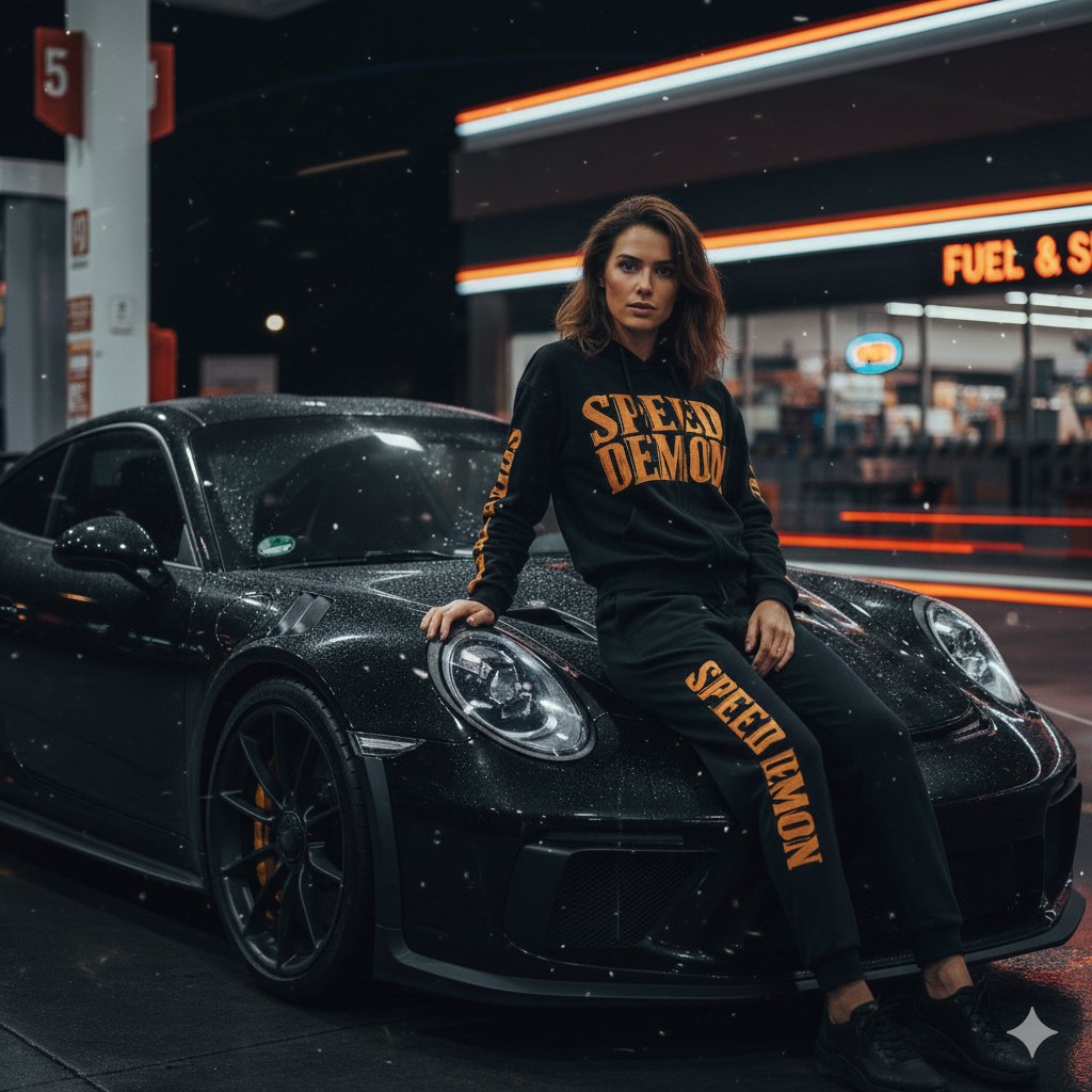 "pose": "apoyada contra el Porsche GT3 RS",