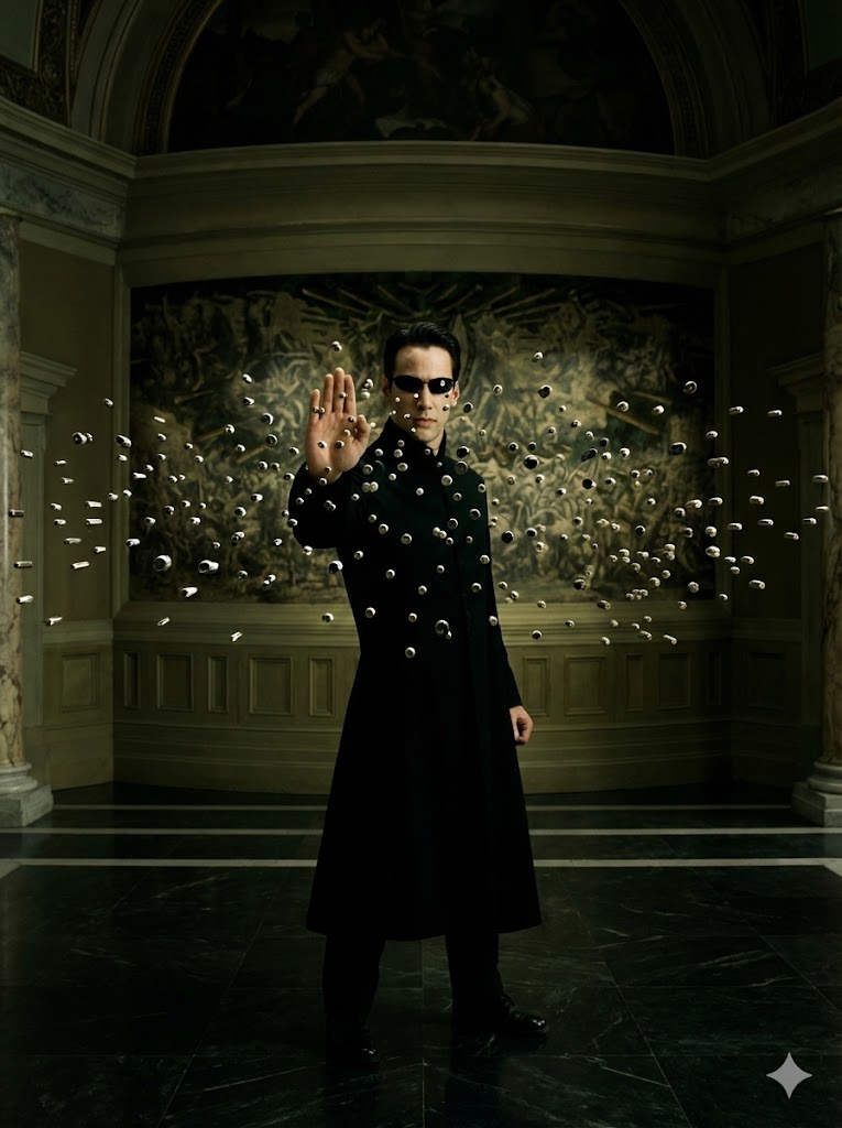 The background is dominated by intense, raging fire, suggesting a destructive or dramatic scene. Tall flames surround her on all sides, creating a wall of orange and yellow light and smoke. The ground appears to be dark and dry, possibly consisting of dirt or burned earth, with some darker, indistinct shapes near the bottom right foreground that could be debris or parts of a fallen structure. The lighting is dominated by the warm, flickering glow of the fire, casting deep shadows and highlighting the woman. The overall atmosphere is intense and dramatic.