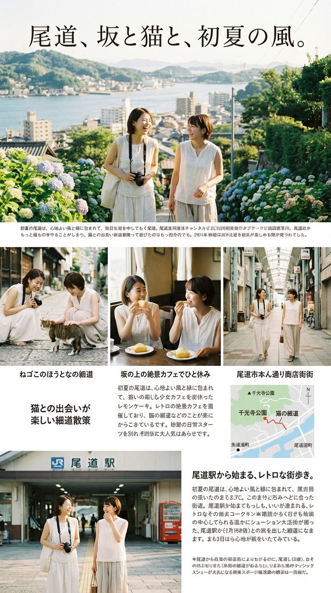 とんでもないな...! もうAIで観光ポスターやパンフレット作れるんじゃないか。 試しに広島県・尾道をテーマに、観光雑誌verで作ってみました👇 めんどくさいので登場人物もそのままNano Banana Proで生成してます。 【雑誌の表紙】 初夏の昼・快晴の天気の中、緯度と経度が34.4059625002507, 133.1961464121396の位置で、二人の女性が観光してるように馴染ませてください。観光雑誌の表紙のように美しくレイアウトしてください。9:16をあますことなく活かし、この雑誌の表紙を作成してください。これが来客数に影響する重要なページだと思って取り組んでください。 【特集ページ】 前回の画像を参照し、同じ女性2人組が緯度と経度が34.4059625002507, 133.1961464121396の周辺エリアで観光してるように馴染ませてください。9:16をあますことなく活かし、美しくレイアウトしてください。様々なシチュエーションの写真を取り入れ、観光雑誌の特集ページを作成してください。文字が潰れたり、文字化けしないように細心の注意を払ってください。これが来客数に影響する重要な読み物のページだと思って、多くの情報を取り入れて取り組んでください。 データが多い観光地なら、おそらく季節・時間帯・天気の指定が可能。 それに「前回の画像を参照し、同じ2人組が」という雑な指示でちゃんと一貫性保てました。 また「周辺エリア」「様々なシチュエーション」を要求することで、レイアウトを変えて付近の写真にしてくれます。 Nano Banana Proすごすぎる...!