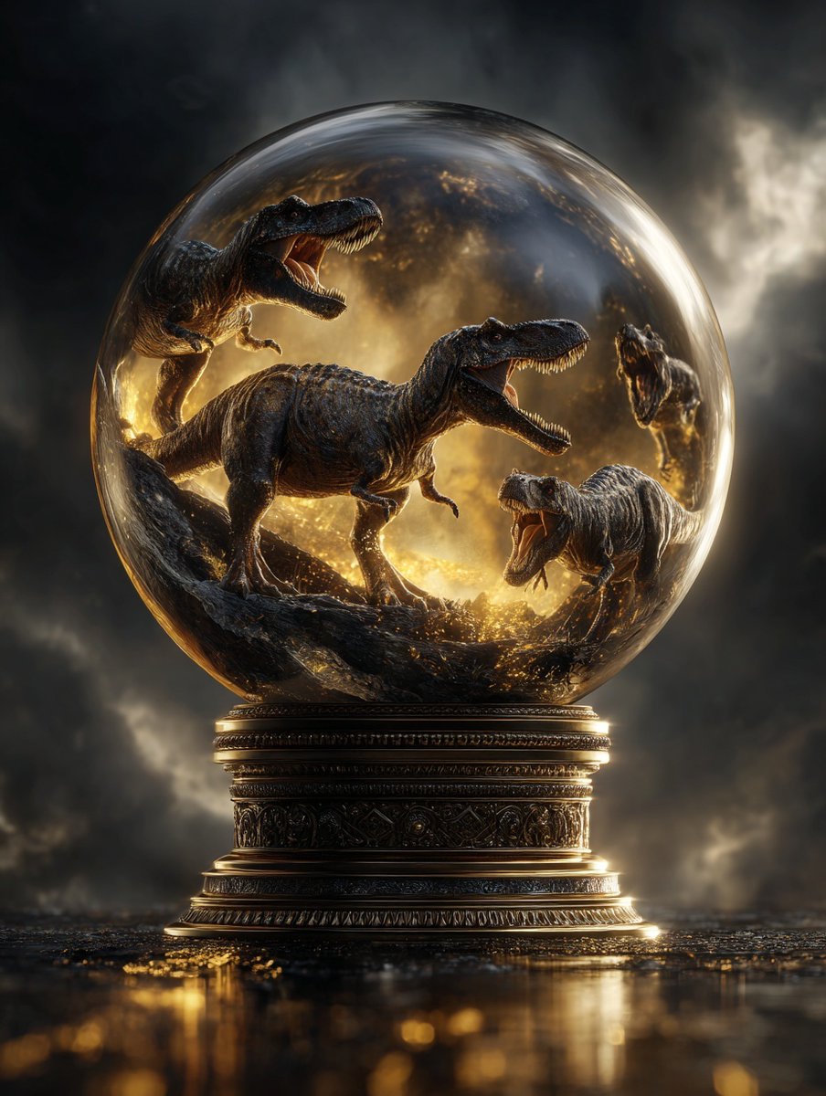 a crystal ball containing t-rexes, surrounded by a misty light, floating on an ancient pedestal, with a dark background and a golden glow emanating from the dinosaurs' bodies, creating a mysterious atmosphere. the entire scene is rendered in high definition, showcasing intricate details of texture and lighting effects.