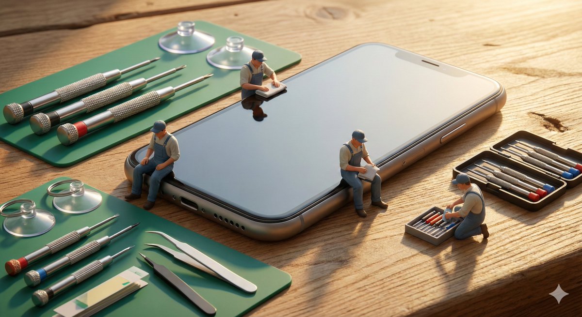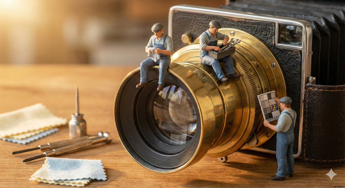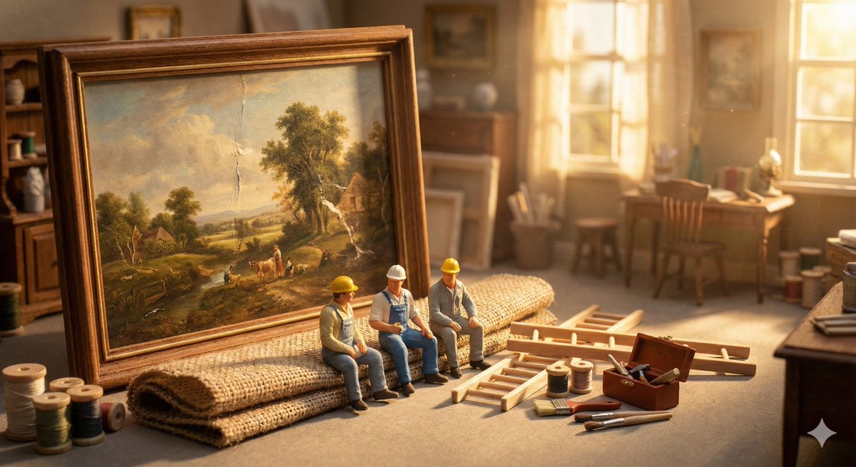 Tiny [WORKERS] sitting, resting, or packing up beside a perfectly restored oversized [BROKEN OBJECT]. Tools neatly arranged, relaxed body language, warm afternoon light, calm mood, sense of closure, handcrafted miniature realism.Restoration complete. The giants stand restored and the workers finally rest. Ge