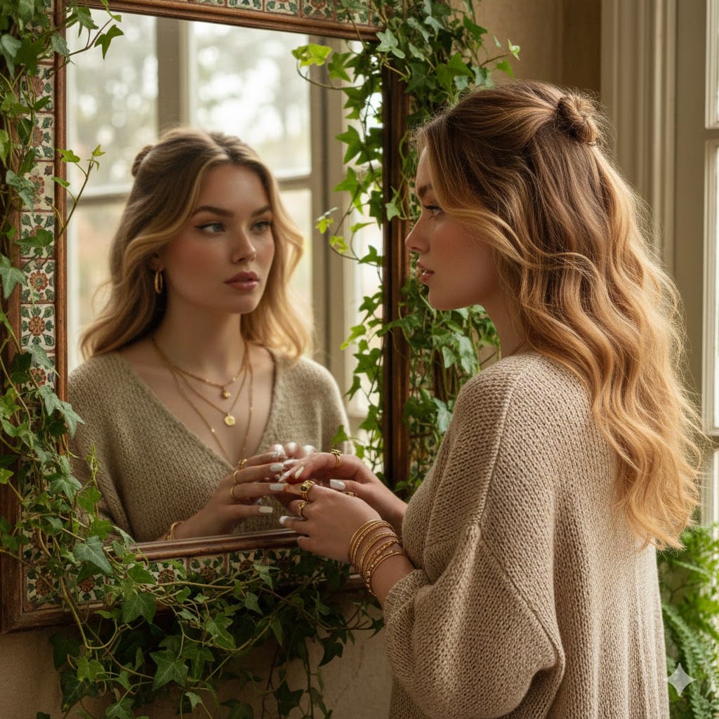 She is looking into a rustic, antique mirror framed with decorative tiles and surrounded by lush green foliage that grows around and over it, suggesting an indoor space with an outdoor feel or a sunroom. The background is gently blurred, emphasiz