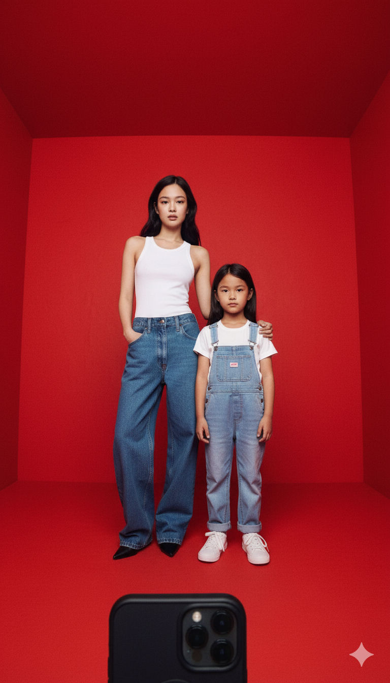 These two photos are of the same girl, one as a child and one as her grown-up self. Please merge the two photos into a single image, where the grown-up version gently places her arm around the child’s shoulder, and they stand together taking a selfie in a red space. The background should be a vivid red wall. The photo should be shot with a wide-angle lens from a low angle, looking upward, as if taken with a real smartphone. Both should be looking directly at the camera, with facial features remaining as close as possible to the original photos. The final image should look highly realistic.