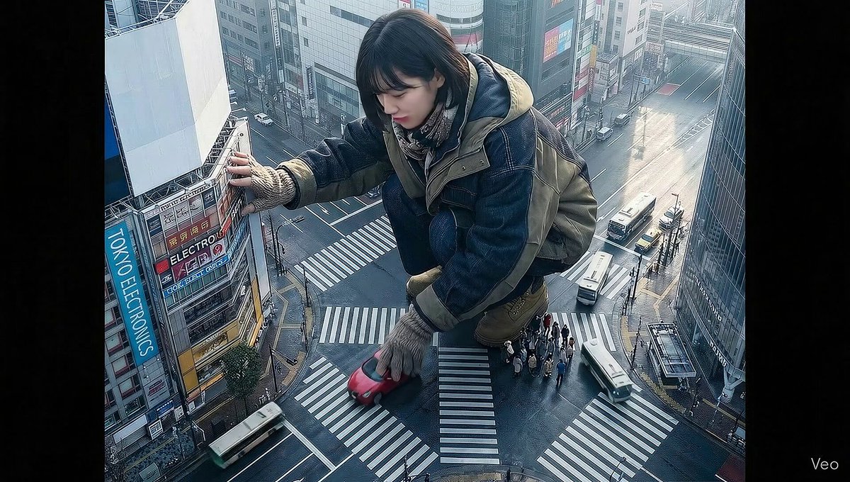 This is really fun idea to use this prompt Wokflow - @FlowbyGoogle Image Nano Banana Pro Veo 3.1 Aniamation Base prompt @MrDavids1 A highly detailed photorealistic aerial shot looking down on a colossal Korean young woman wearing a stylish jacket and layered outfits, positioned in a crowded Tokyo street; the giant is playfully driving a tiny car with her hands while interacting with nearby buildings and street signs, tiny people and cars clustered near her feet for scale; visible close-up hands and textured clothing details; morning daylight with soft directional sunlight casting long gentle shadows, cool urban reflections on wet pavement, slight atmospheric haze and depth of field, high-resolution, crisp details, cinematic composition with leading lines along the street, muted vibrant color palette, realistic skin textures and fabric wrinkles, subtle motion blur on the tiny cars, photorealistic lens characteristics